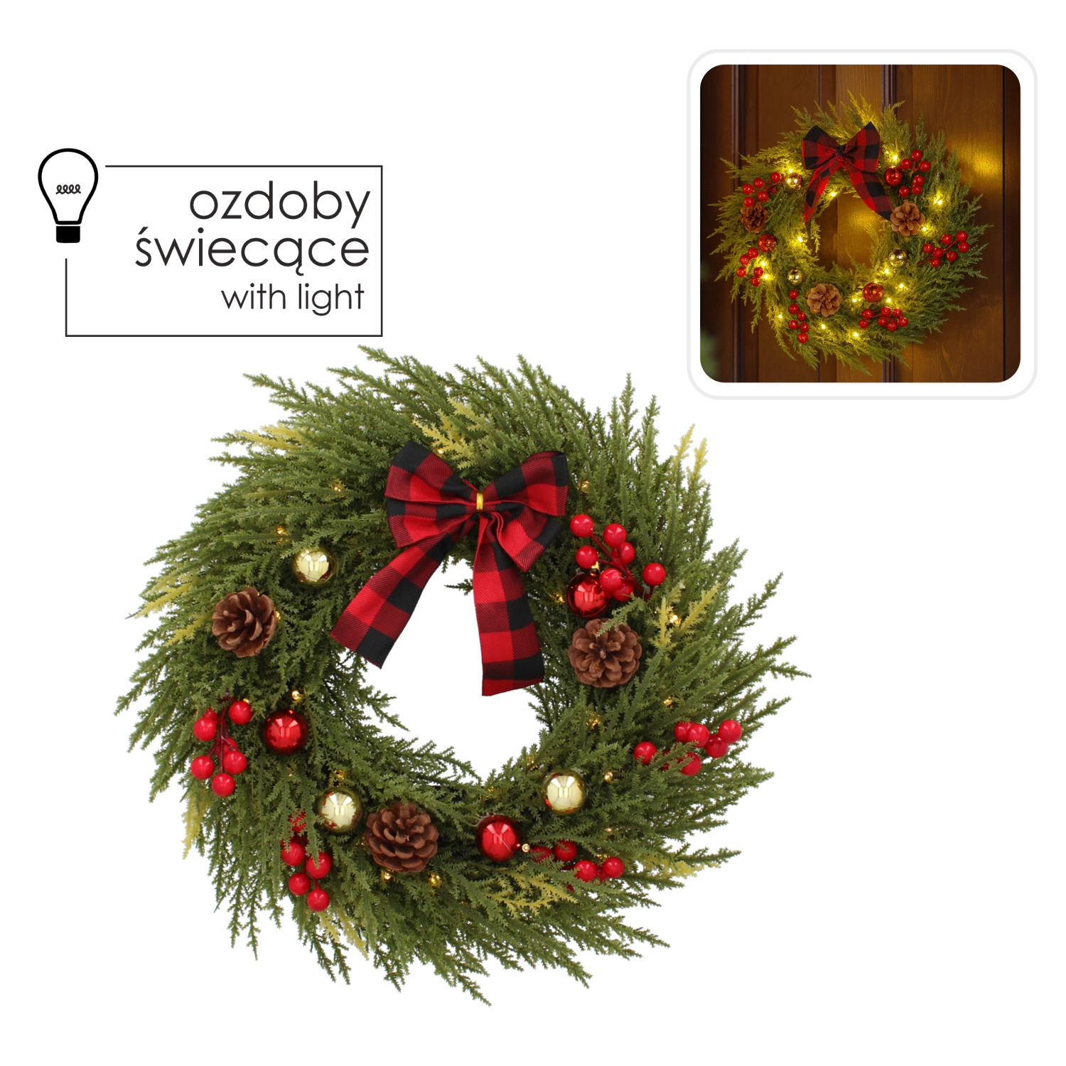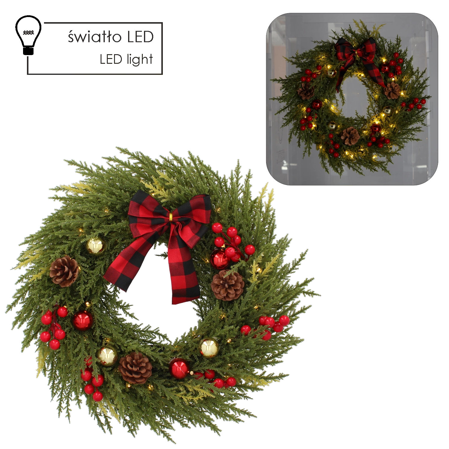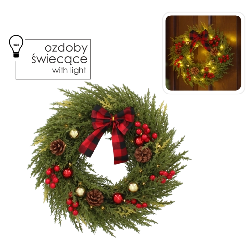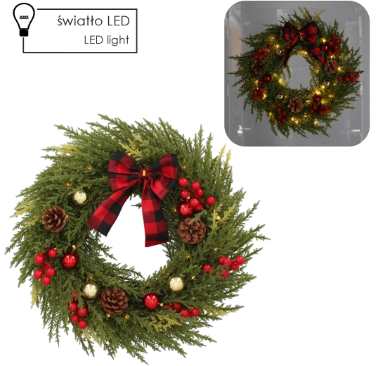 Elegancki świąteczny wieniec LED wnosi do domu przytulną atmosferę dzięki ciepłemu białemu światłu oraz bogatemu, realistycznemu wyglądowi igliwia uzupełnionemu o dekoracyjne elementy, takie jak jagody, szyszki i stylowa kraciasta kokarda. Dzięki zasilaniu 3× AA łatwo umieścisz go na drzwiach, ścianie lub oknie bez widocznych kabli.
