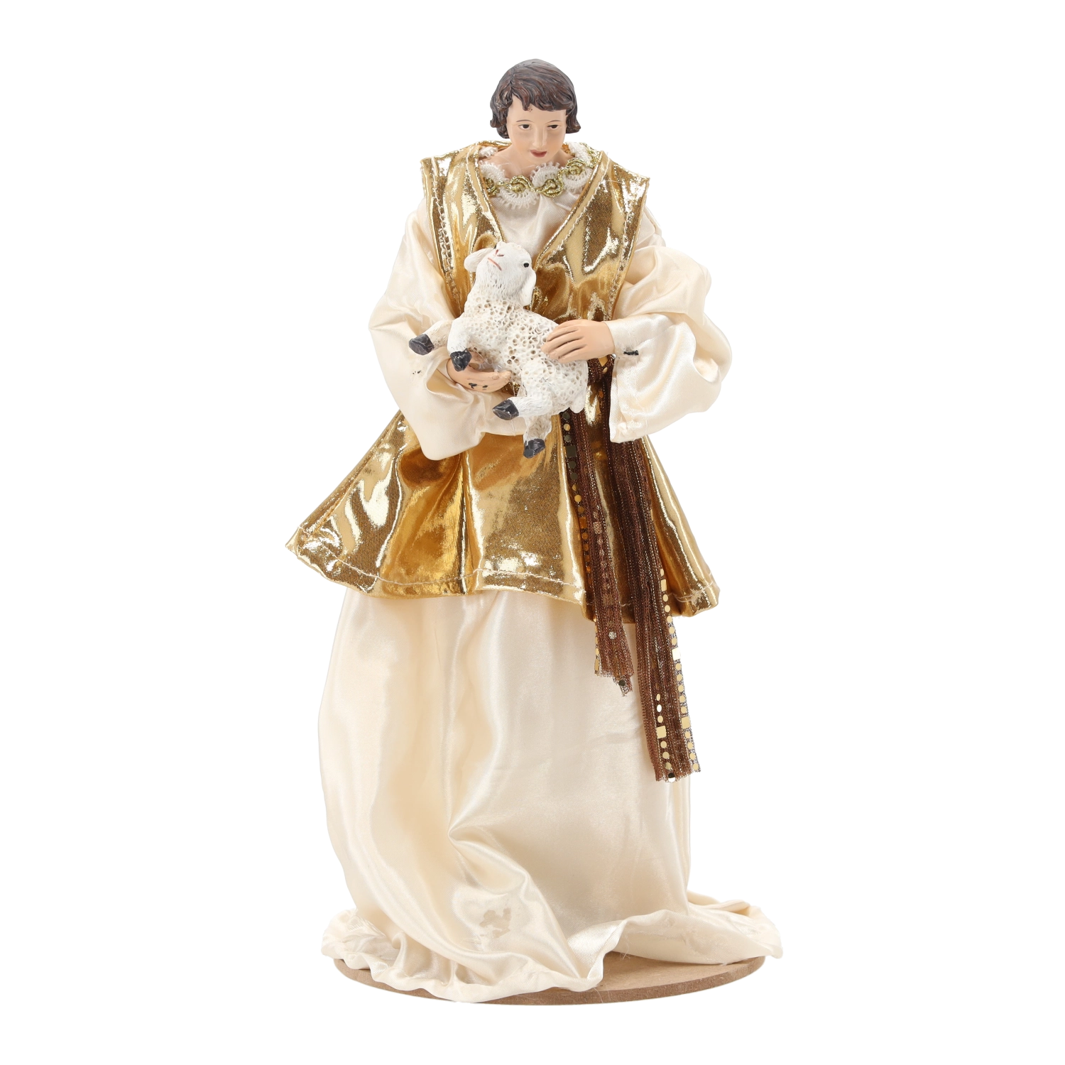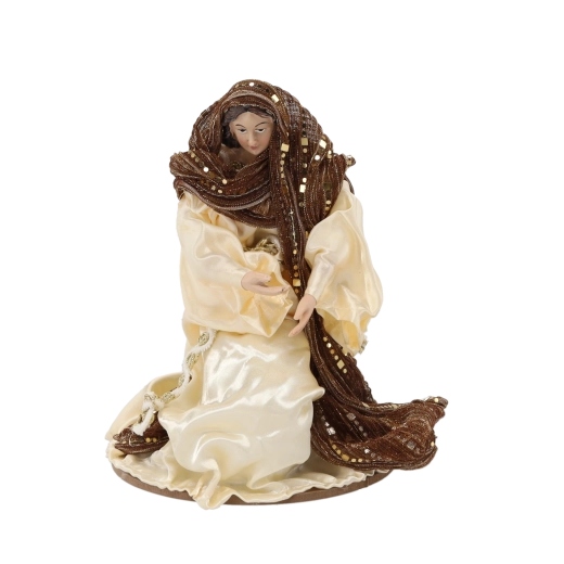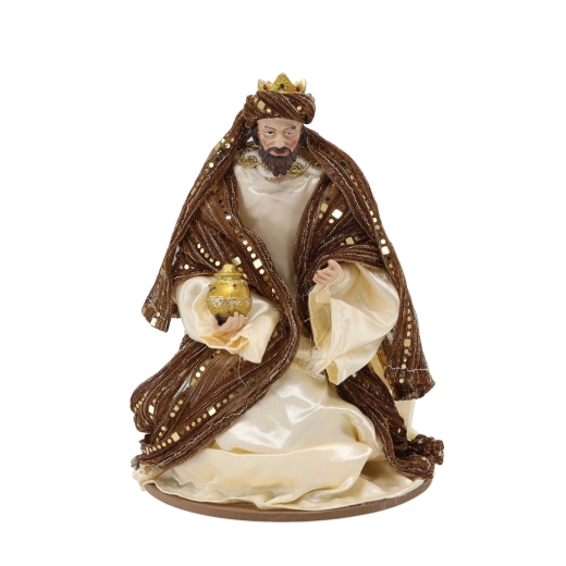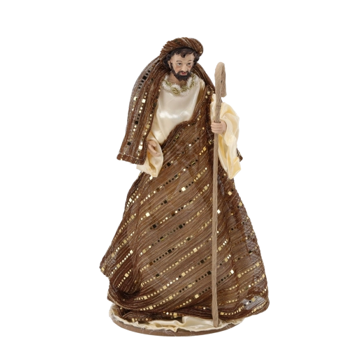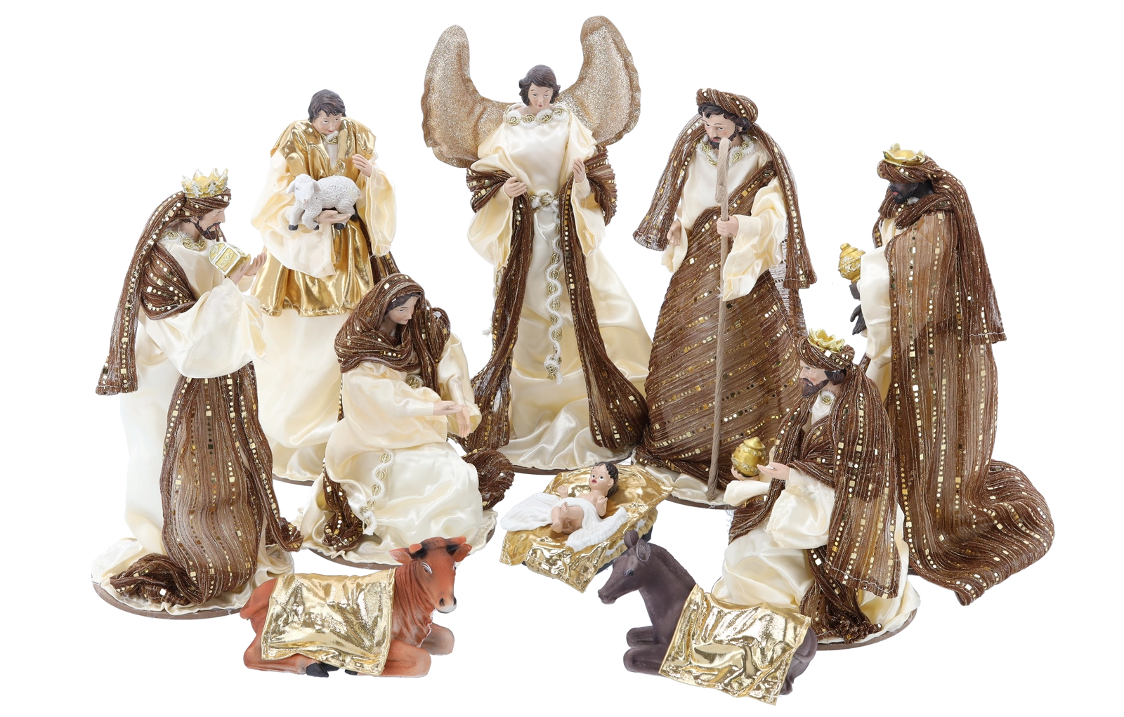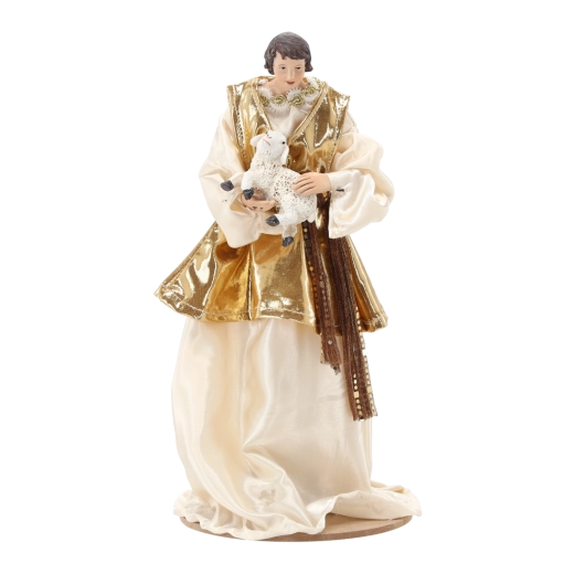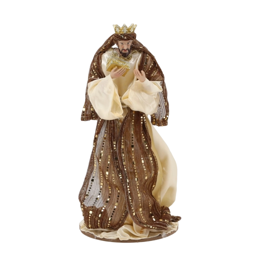 Ten reprezentacyjny zestaw szopki obejmuje Św. Rodzinę, anioła, trzech królów, pasterza i dwa zwierzęta. Figury w kremowych i brązowych tonach ze złotymi detalami prezentują się elegancko i ponadczasowo, dzięki czemu świetnie pasują do klasycznych i nowoczesnych wnętrz. Materiał z żywicy zapewnia długą trwałość i stabilność.