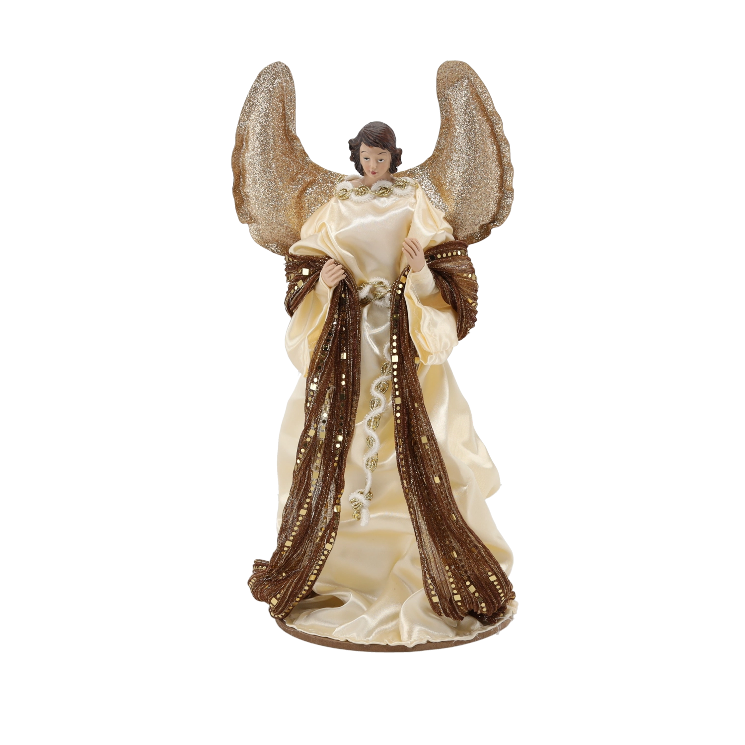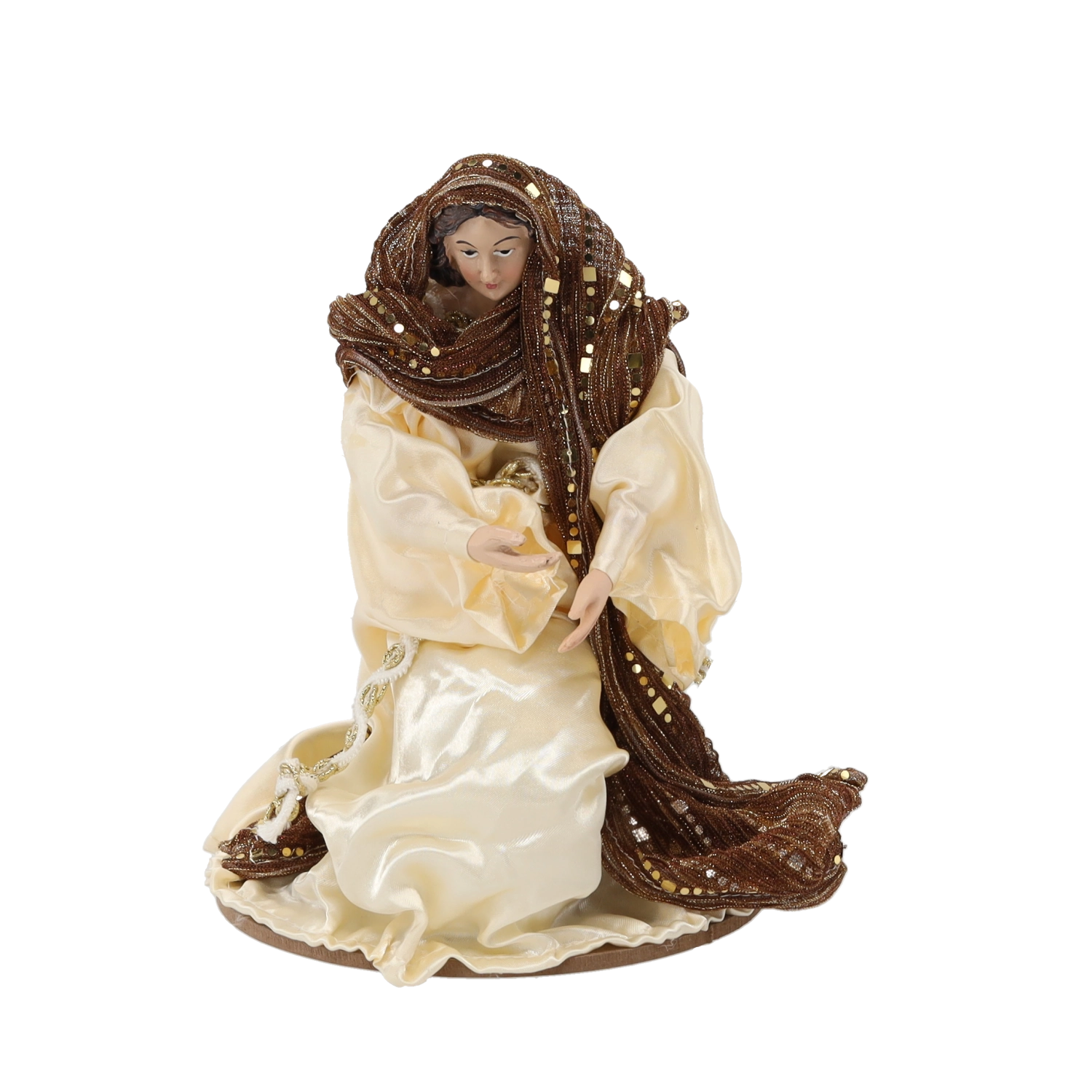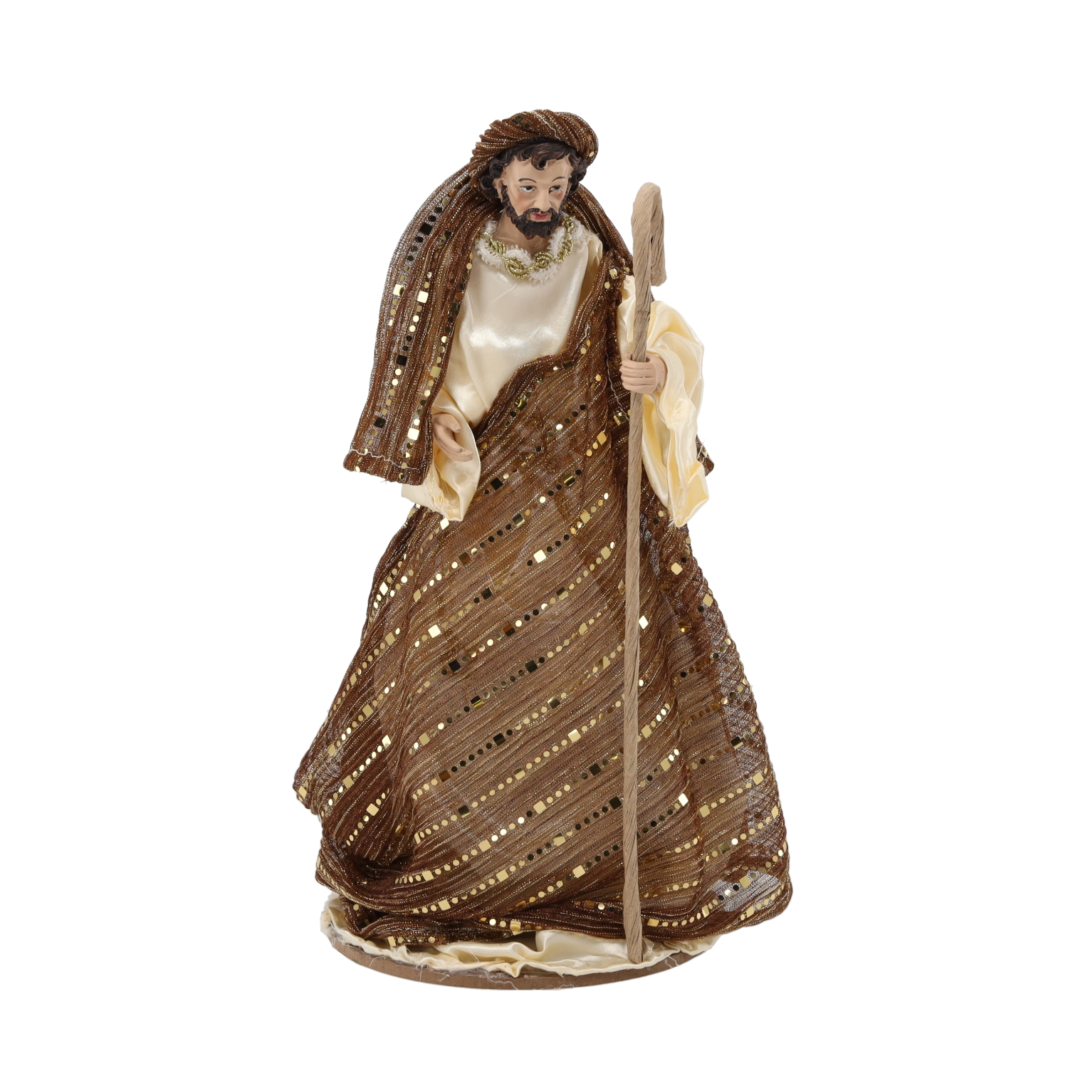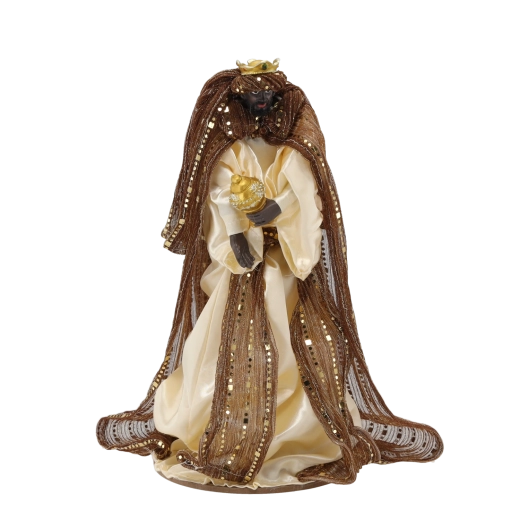 Ten reprezentacyjny zestaw szopki obejmuje Św. Rodzinę, anioła, trzech królów, pasterza i dwa zwierzęta. Figury w kremowych i brązowych tonach ze złotymi detalami prezentują się elegancko i ponadczasowo, dzięki czemu świetnie pasują do klasycznych i nowoczesnych wnętrz. Materiał z żywicy zapewnia długą trwałość i stabilność.