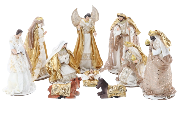 Ten reprezentacyjny zestaw obejmuje Świętą Rodzinę, anioła, Trzech Króli, pasterza oraz zwierzęta – wszystko w harmonijnym, biało‑złotym stylu, który pasuje do nowoczesnych i klasycznych wnętrz. Ręcznie dopracowane detale i subtelne metaliczne akcenty nadają scenie wyjątkowy charakter.