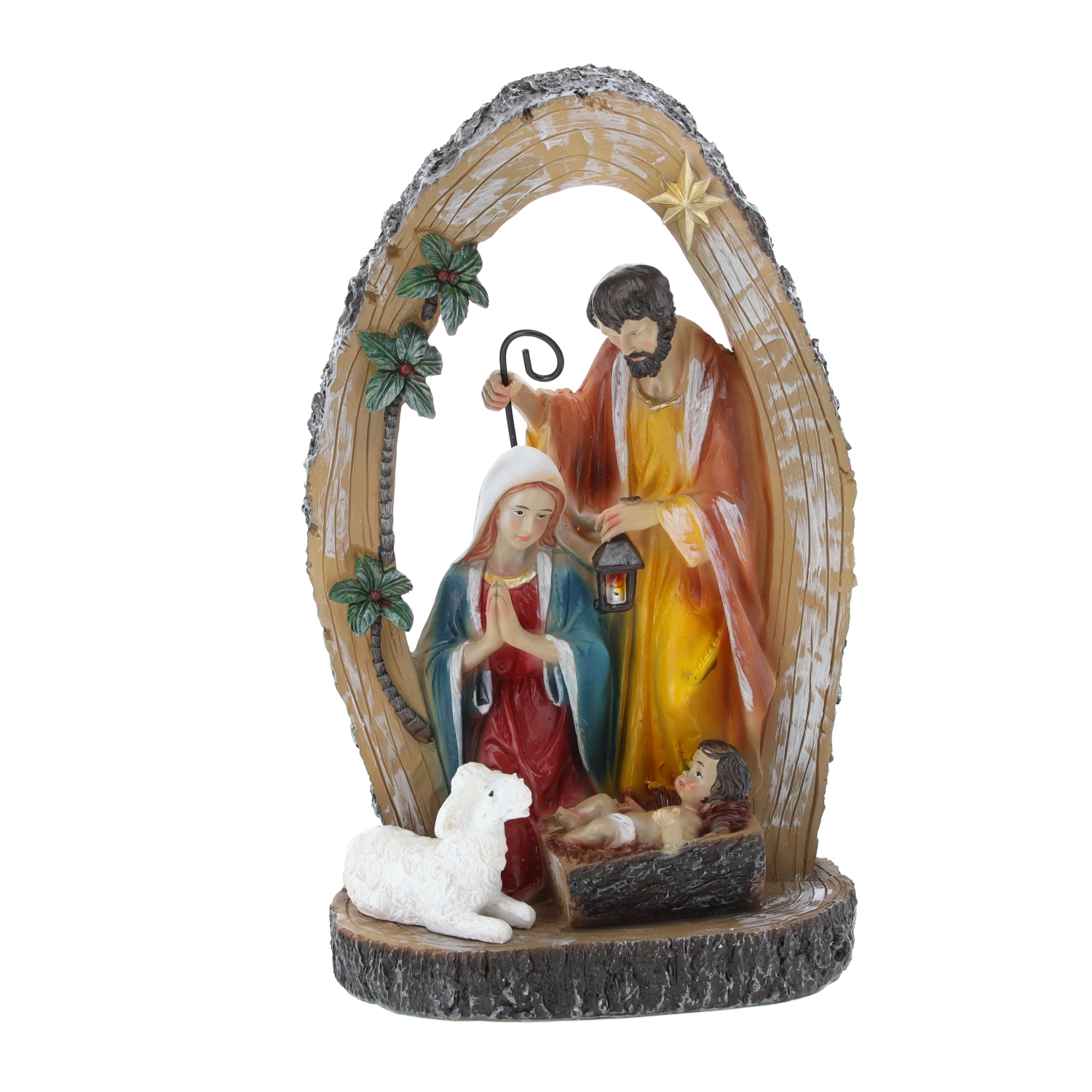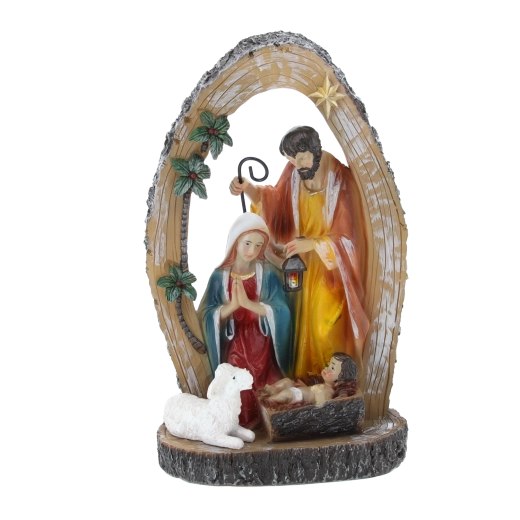 Ta wysokiej jakości świąteczna figurka przedstawia Maryję w modlitwie, Józefa z latarnią oraz Dzieciątko Jezus w żłóbku, uzupełnione o pasterza, owieczkę i gwiazdę betlejemską. Połączenie tradycyjnego motywu z subtelnym wykonaniem wprowadza do wnętrza spokój, harmonię i duchowy wymiar świątecznych dni.