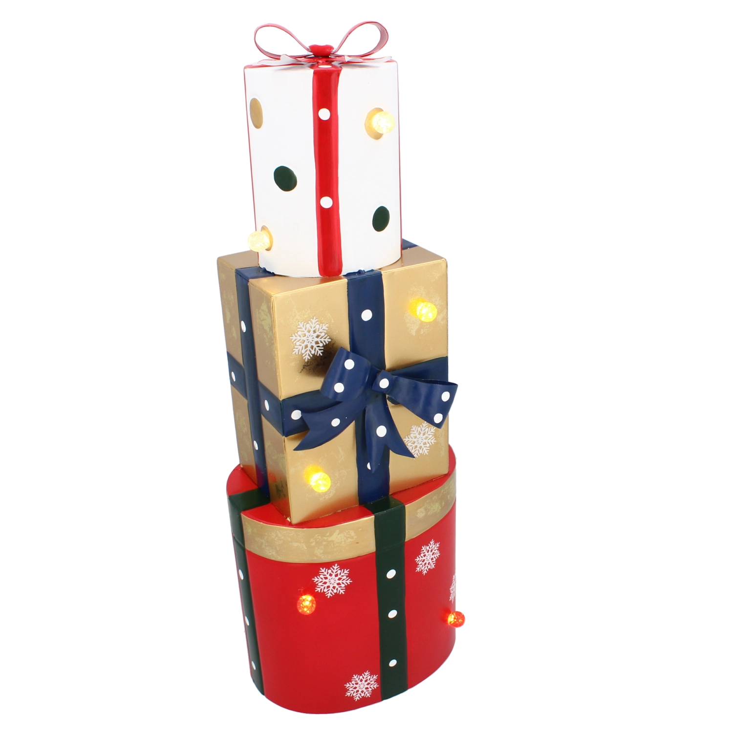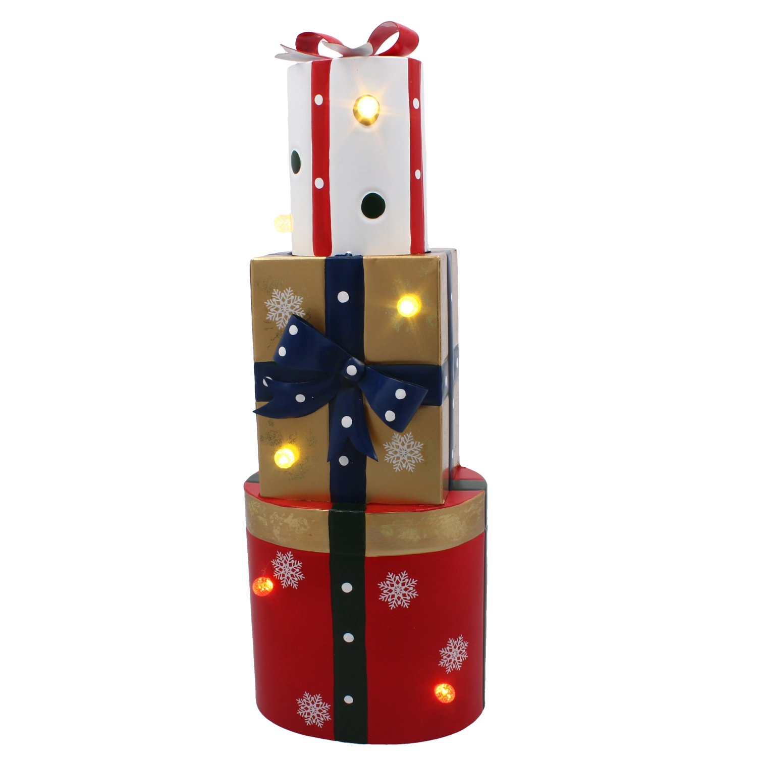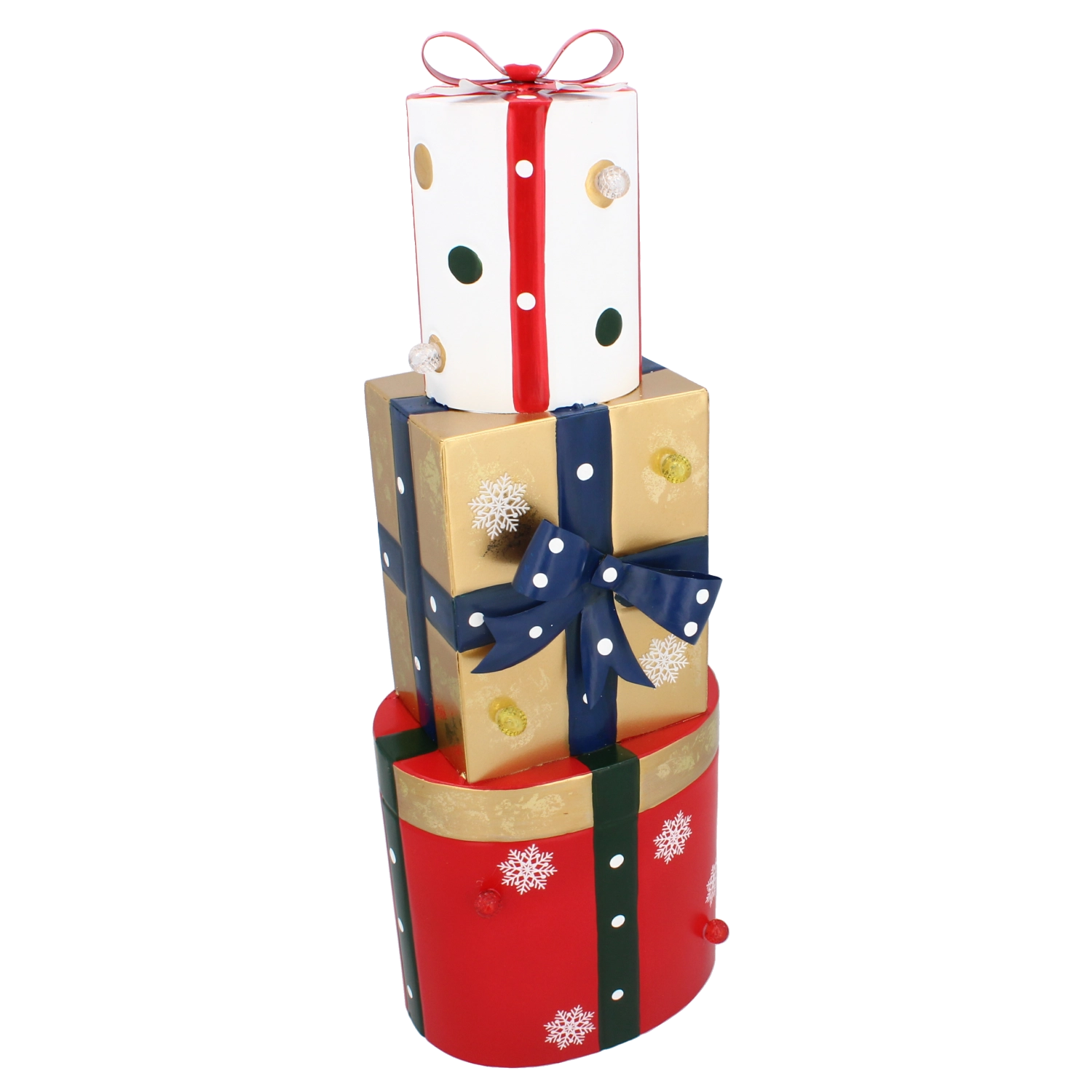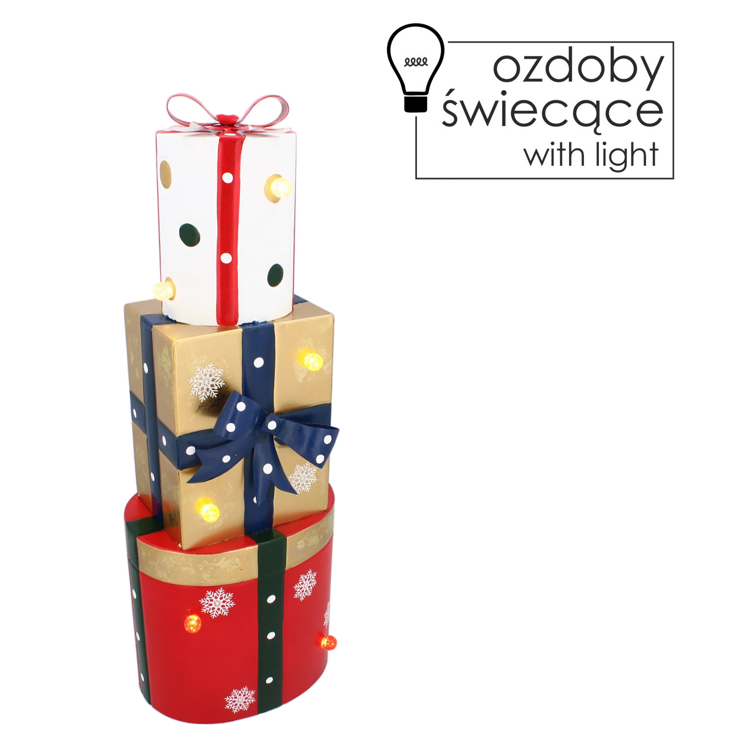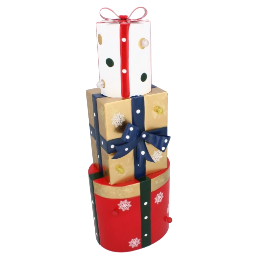 Ta stylowa metalowa dekoracja w formie trzech ułożonych w stos prezentów w kolorach czerwonym, złotym i białym została wyposażona w ciepłe białe diody LED, które tworzą przyjemne, miękkie światło. Połączenie wysokiej jakości metalowego wykonania i subtelnego podświetlenia wygląda nowocześnie, a zarazem przytulnie, idealnie do świątecznego wystroju domu.