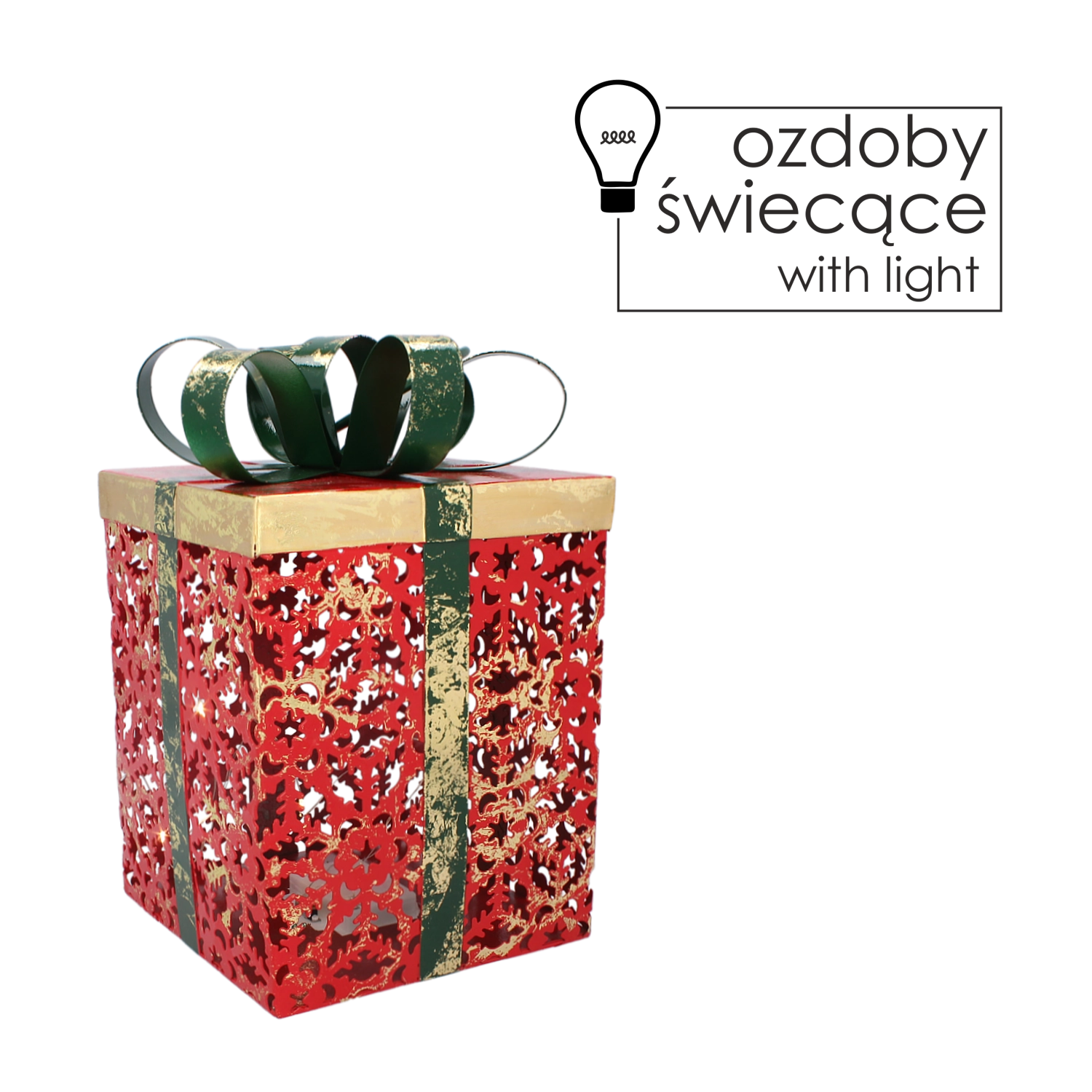 Dodaj swojemu domowi świątecznego uroku dzięki tej stylowej metalowej dekoracji w kształcie prezentu. Czerwone wykończenie z subtelnymi wycięciami pozwala oświetleniu LED pięknie przenikać i tworzyć efektowne świetlne akcenty, a zielona kokarda podkreśla tradycyjny świąteczny wygląd.
