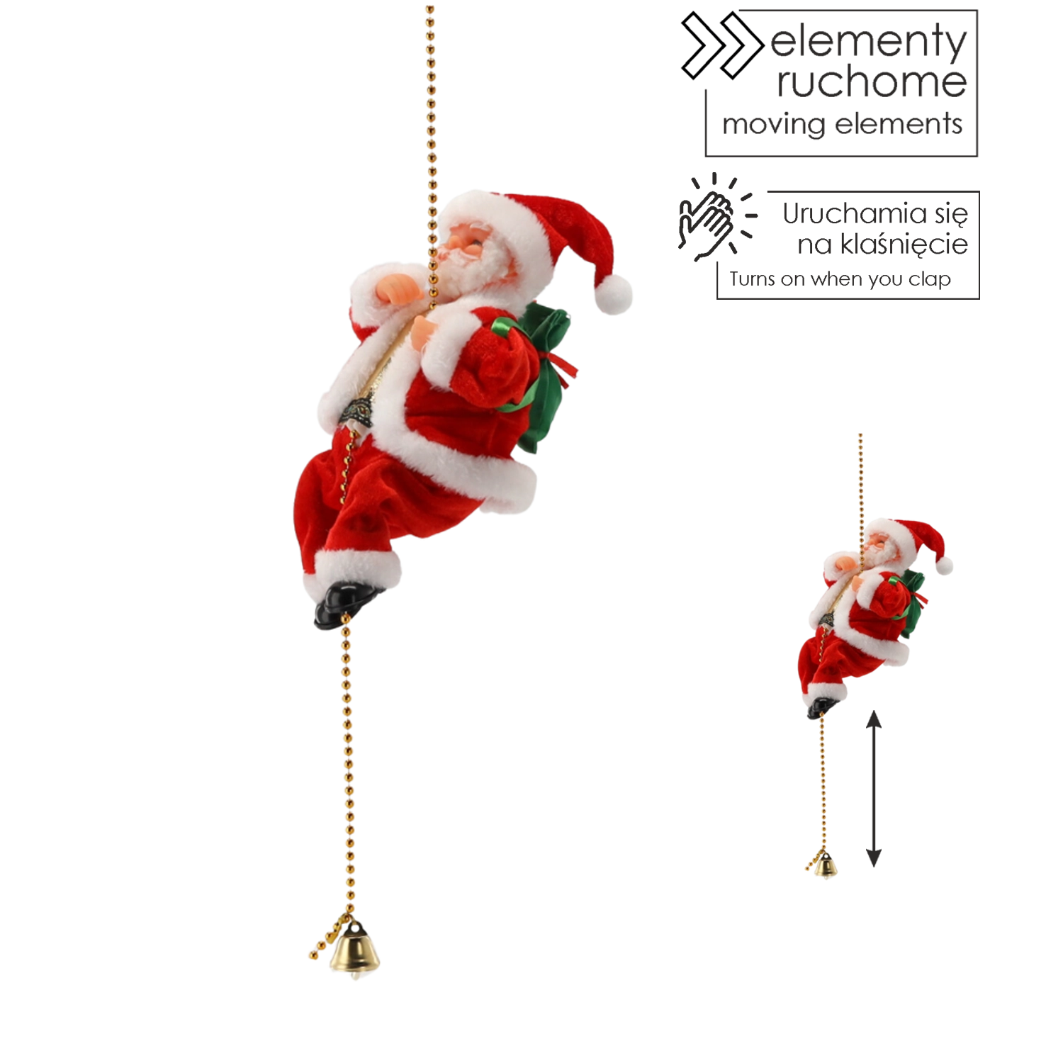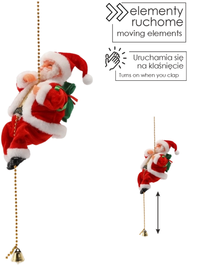 Ożyw swój dom świąteczną atmosferą dzięki temu ruchomemu Mikołajowi, który „wspina się” po złotym łańcuszku z dzwoneczkiem. Figurka w klasycznym czerwonym płaszczu z białym obszyciem i zielonym workiem prezentów oferuje efektowny ruch w górę i w dół, tekstylne wykończenie z dbałością o detale oraz łatwe zawieszenie jako świąteczna dekoracja w salonie, pokoju dziecięcym lub witrynie sklepowej.