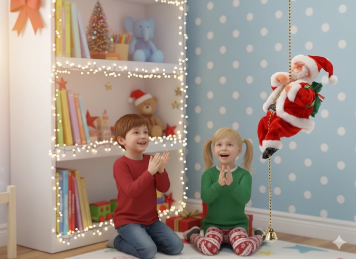 Mikołaj „wspina się” po złotym łańcuszku i tworzy żywą, świąteczną atmosferę w każdym wnętrzu – od salonu po pokój dziecięcy.