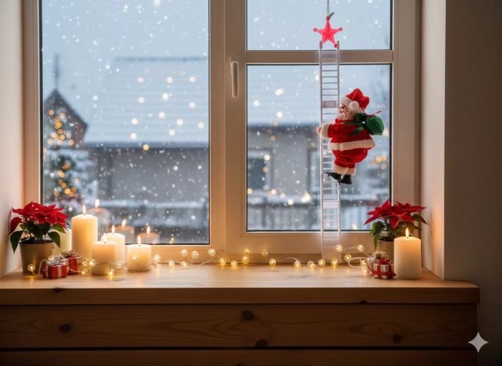 Mikołaj wspina się po drabinie, tworząc czarujący efekt ruchu, który zainteresuje zarówno dzieci, jak i dorosłych.