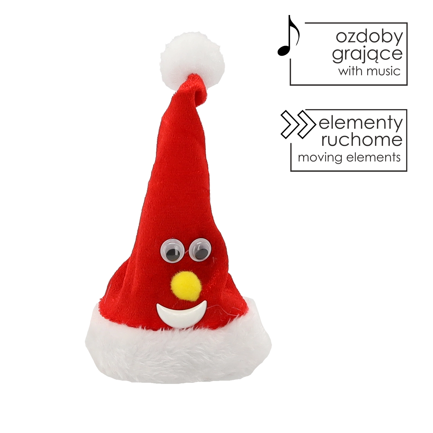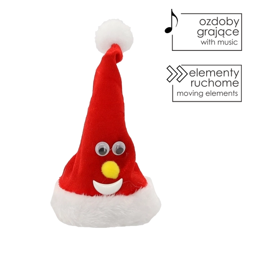 Rozjaśnij święta dzięki tej ruchomej czapce świątecznej Mikołaja o wysokości 13 cm, która po włączeniu tańczy i wydaje wesołe dźwięki. Dzięki zasilaniu bateryjnemu łatwo umieścisz ją w dowolnym miejscu bez kabli – na stole, półce czy pod choinką. Przyjemny materiał i kompaktowe wymiary sprawiają, że to idealna dekoracja do stworzenia magicznej świątecznej atmosfery.