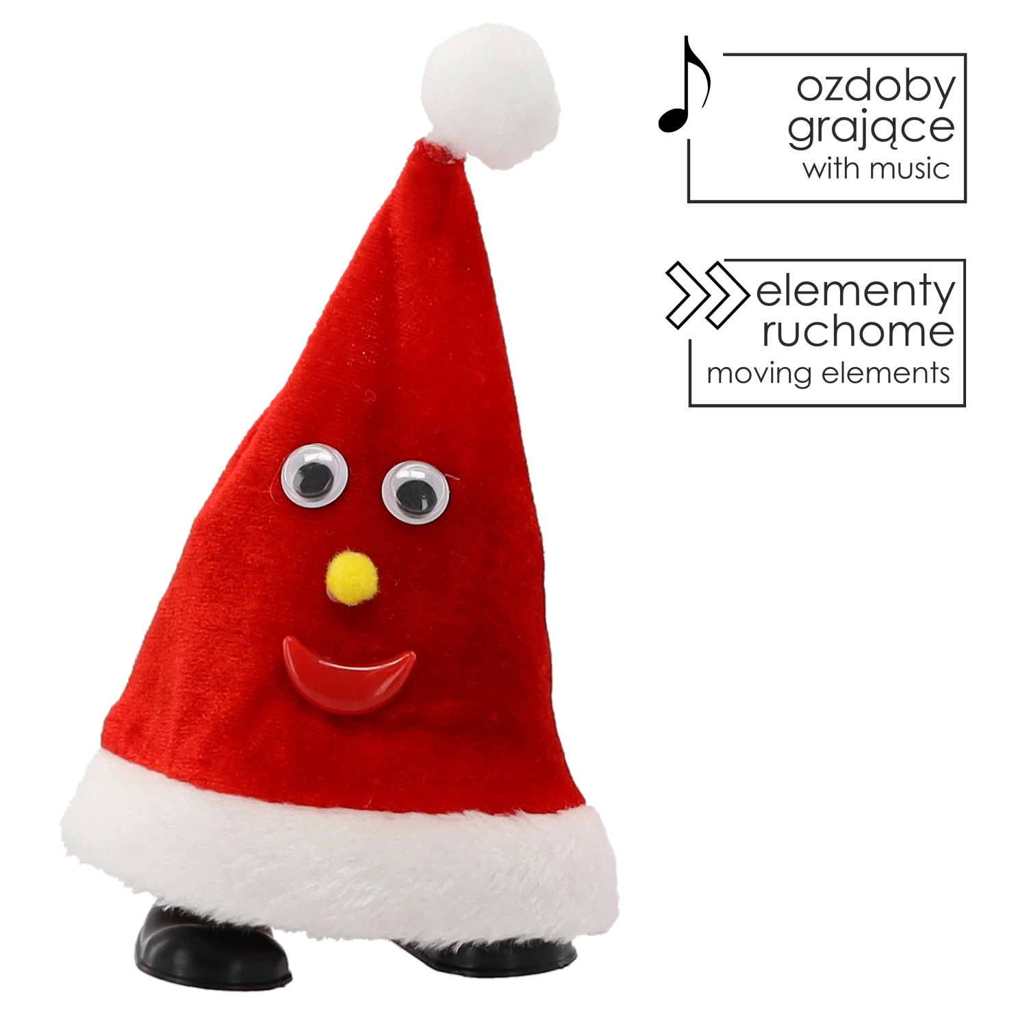 Rozwesel swój dom dzięki tej interaktywnej czapce Mikołaja o wysokości 20,5 cm, która po włączeniu tańczy i odtwarza wesołe melodie. Dzięki ruchomym oczom, żółtemu nosowi i szerokiemu uśmiechowi przyciągnie uwagę dzieci i dorosłych. Wysoka jakość wykonania, łatwa obsługa oraz zasilanie na 3× baterie AA sprawiają, że to świetna dekoracja i oryginalny prezent.