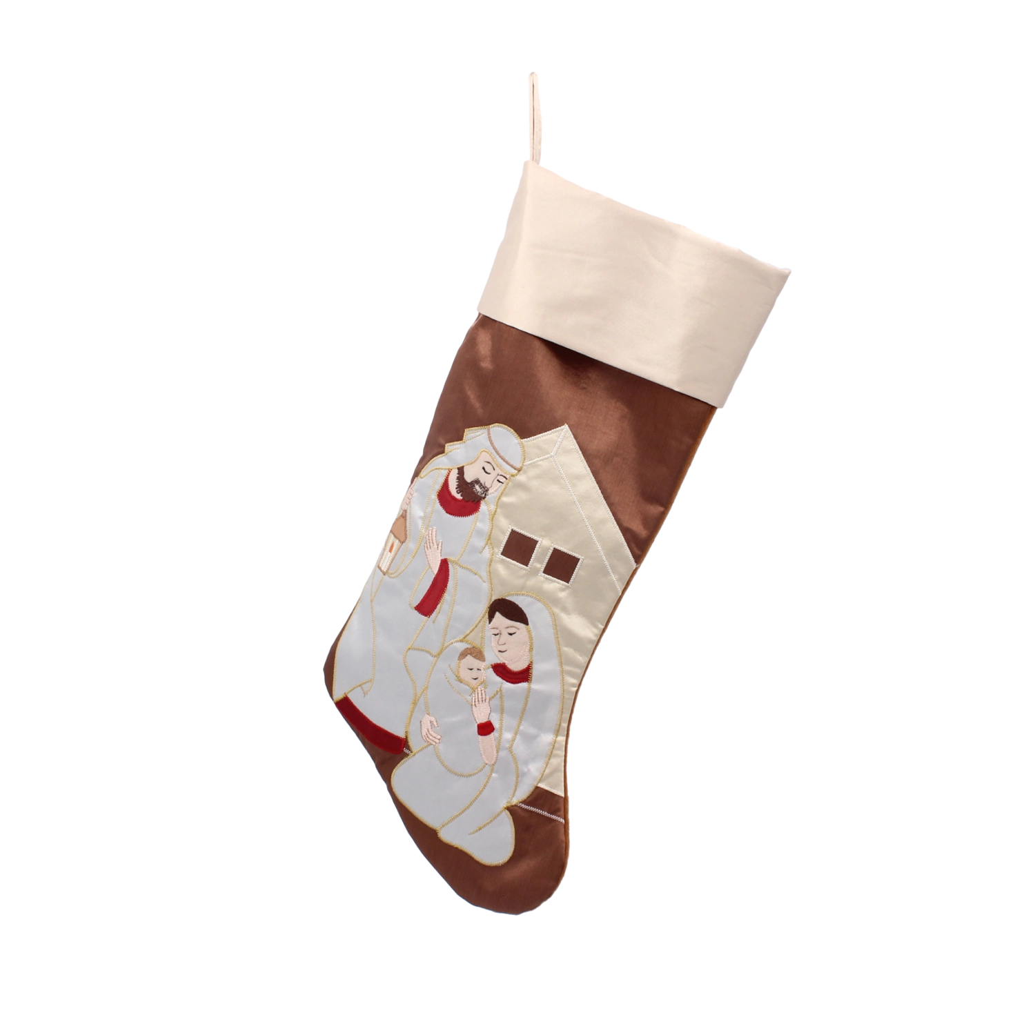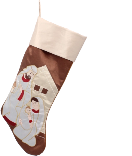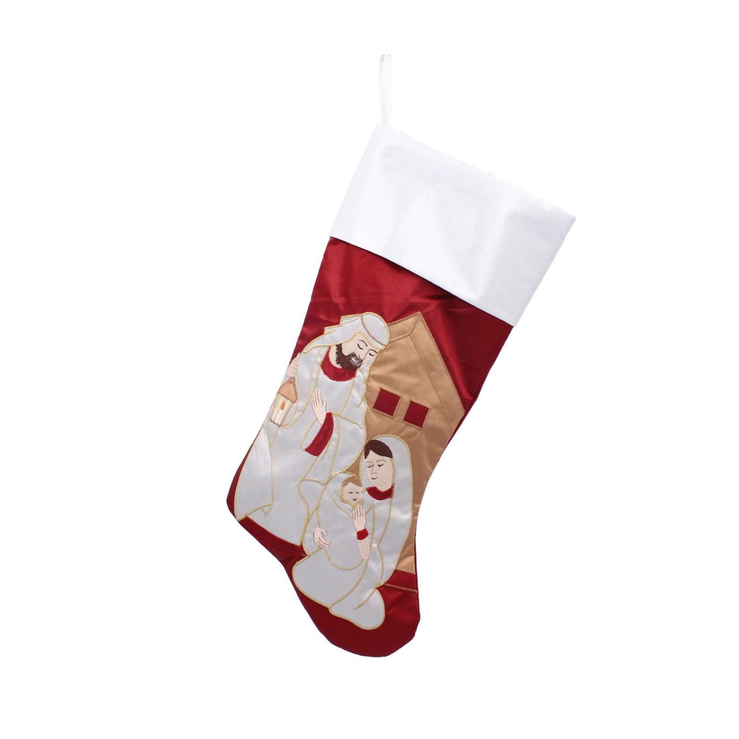 Detalicza aplikacja Świętej Rodziny w scenerii stajenki nadaje skarpecie tradycyjny wygląd i staje się dominantą Twojej świątecznej dekoracji.