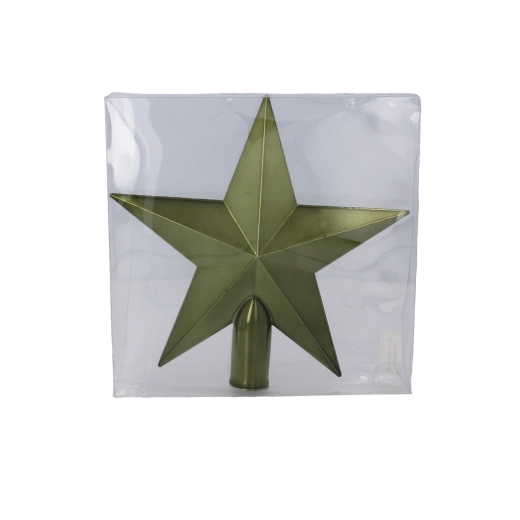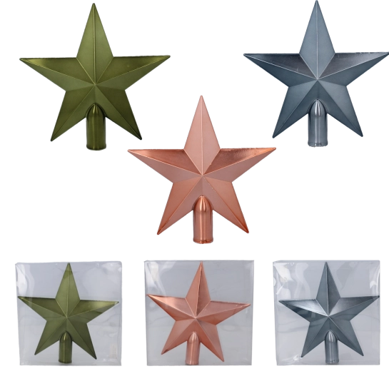 Elegancka gwiazda na czubek choinki o wysokości 20 cm doda drzewku nowoczesnego blasku i świątecznej atmosfery. Lekki i wytrzymały plastik zapewnia łatwy montaż i długą żywotność. Dostępna w trzech wyrafinowanych kolorach: oliwkowym, miedzianym i grafitowym – idealna do większości wnętrz.
