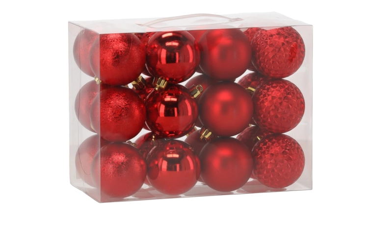Elegancki zestaw 24 bombek o średnicy 6 cm w kolorach czerwonym, złotym i srebrnym z mixem wzorów nada Twojej choince klasyczny i nowoczesny charakter. Ozdoby wykonano z nietłukącego materiału, co zapewnia bezpieczne użytkowanie w domach z dziećmi lub zwierzętami, a dzięki delikatnym sznureczkom do zawieszania w kolorze złotym lub srebrnym łatwo je powiesić.