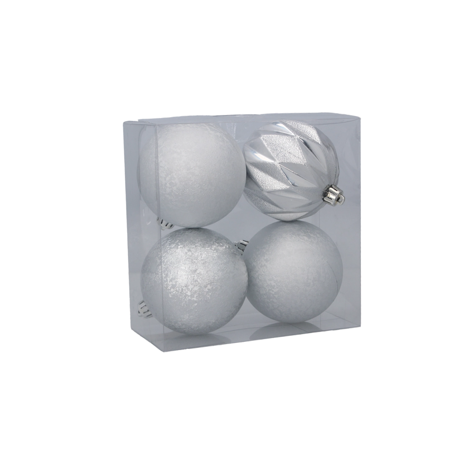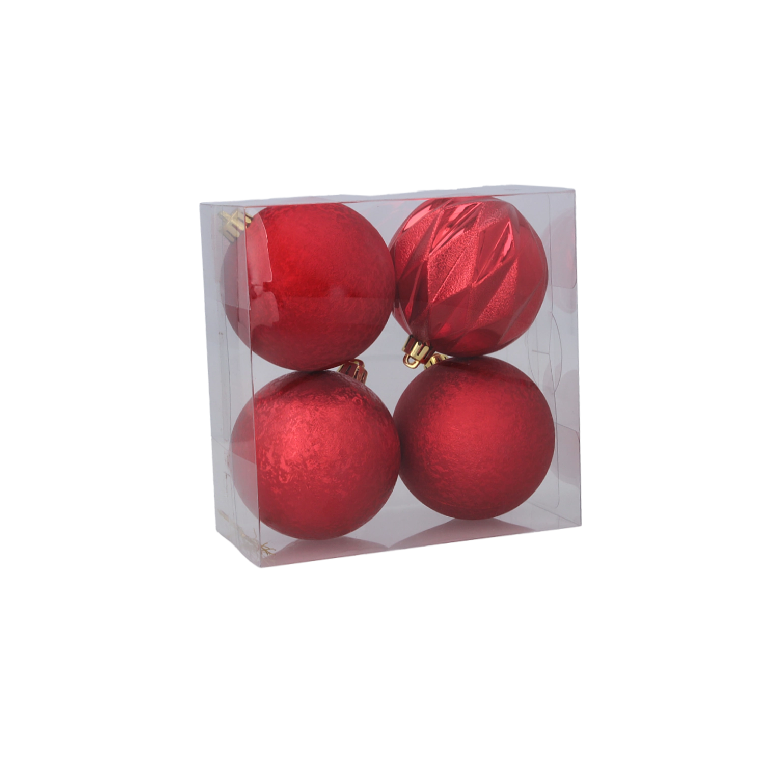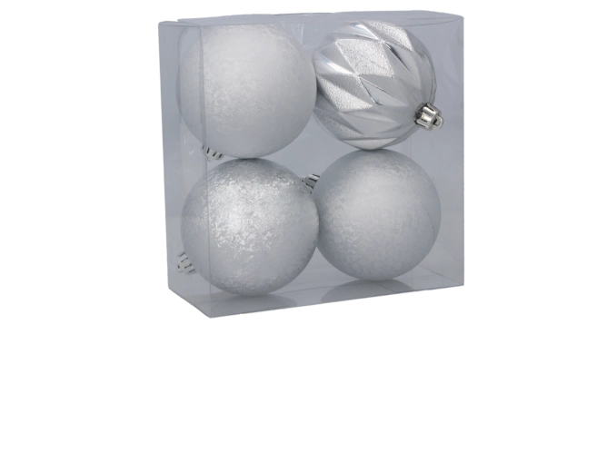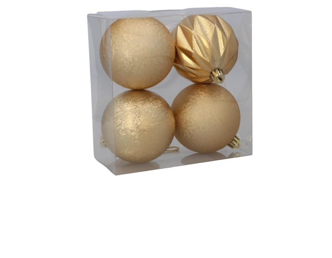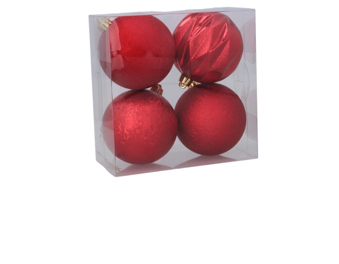 Ten elegancki zestaw czterech plastikowych bombek świątecznych oferuje harmonijne połączenie czerwieni, złota i srebra. Każda bombka ma inną powierzchnię – od matowej i delikatnie teksturowanej po błyszczącą i fasetowaną – co tworzy dynamiczny, a zarazem gustownie zgrany wygląd na Twojej choince.