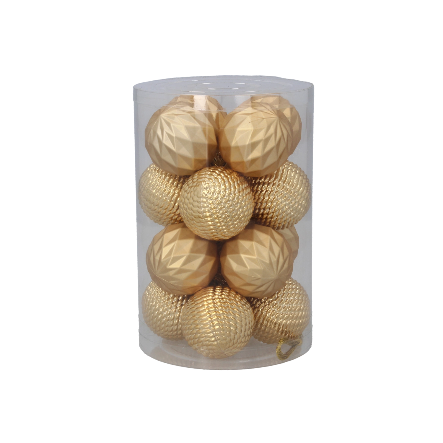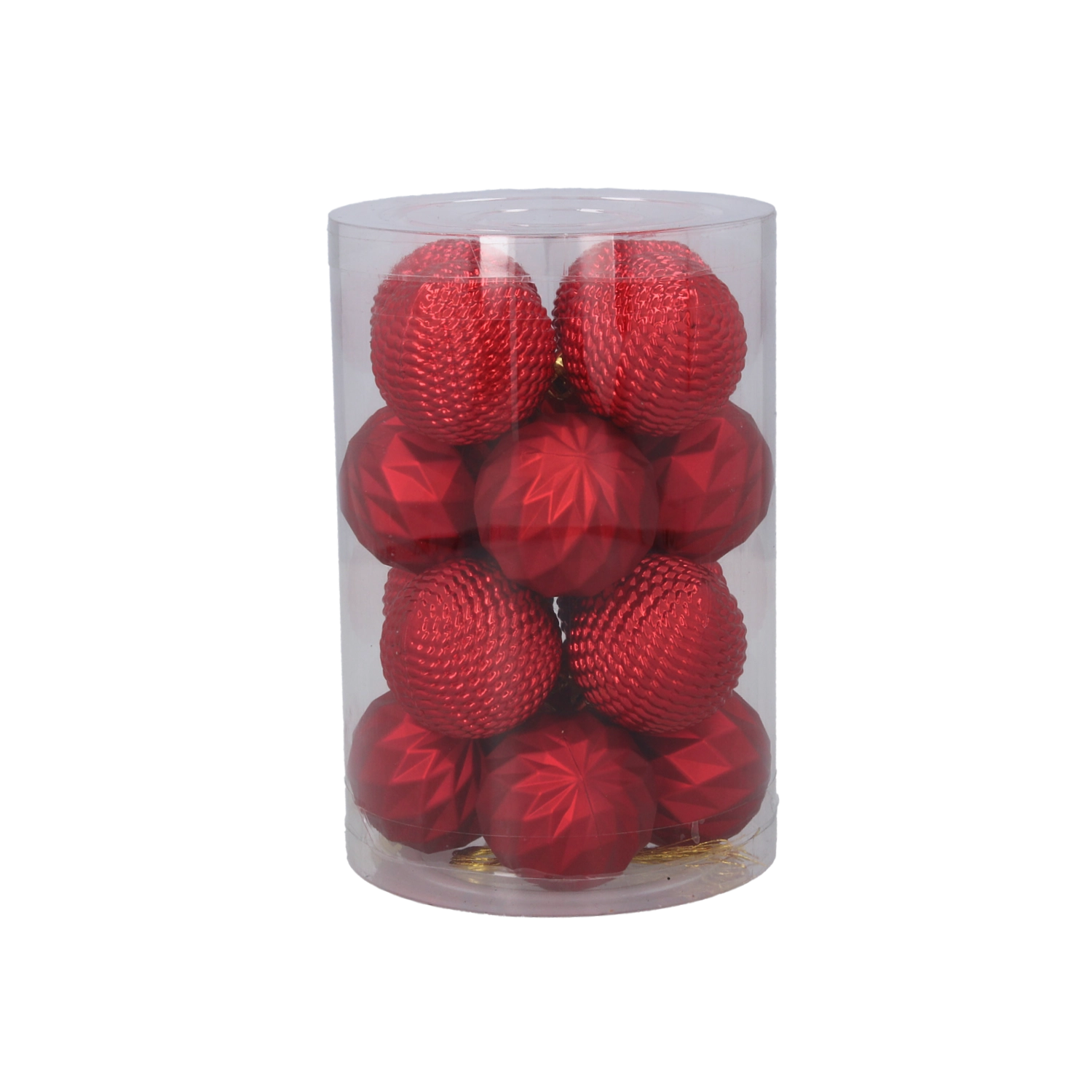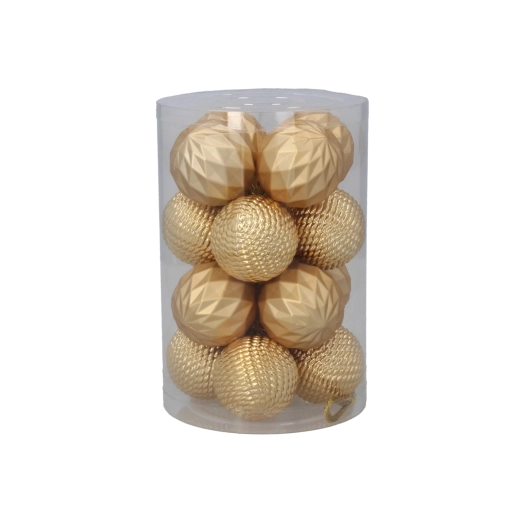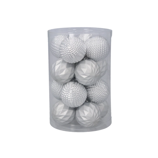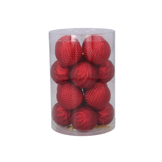 Elegancki zestaw 16 ozdób choinkowych o średnicy 4 cm w połączeniu kolorów czerwonego, złotego i srebrnego nada drzewku tradycyjny i uroczysty wygląd. Ozdoby z nietłukącego się materiału są bezpieczne, lekkie i trwałe. Praktyczne opakowanie w przezroczystej tubie ułatwia przechowywanie i przenoszenie.