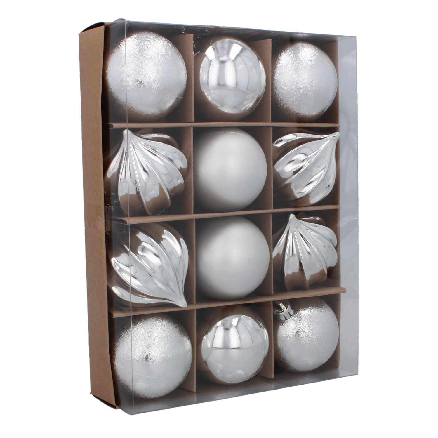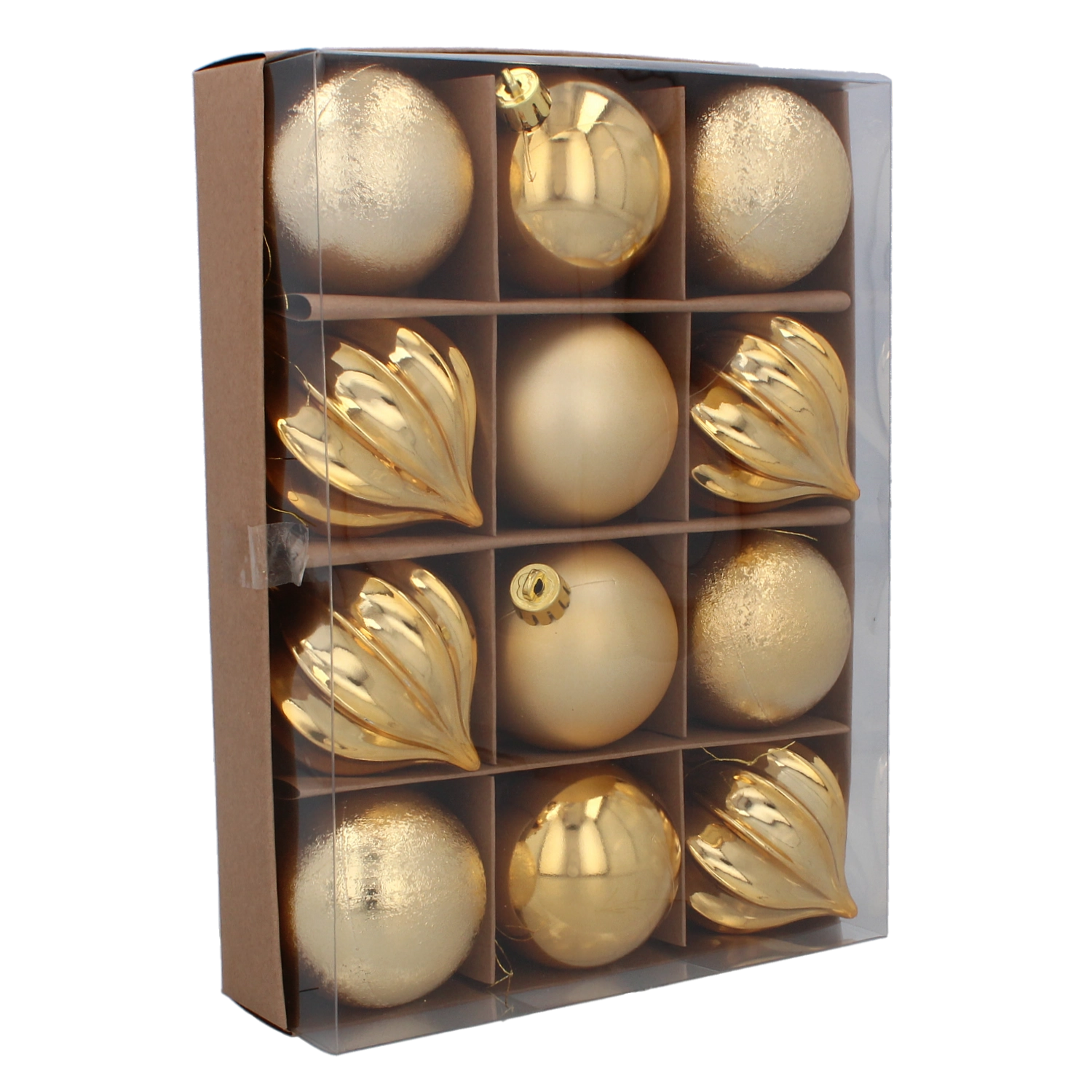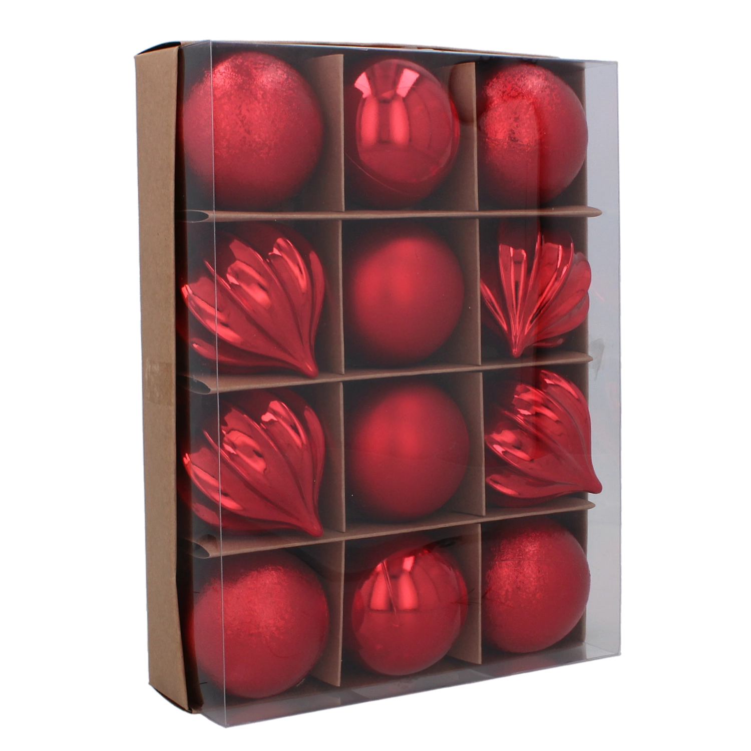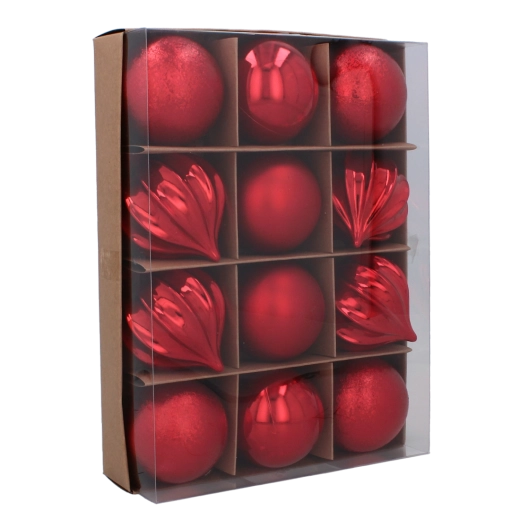 Elegancki zestaw 12 bombek choinkowych o średnicy 6 cm w połączeniu kolorów czerwonego, złotego i srebrnego nadaje choince tradycyjnego charakteru. Ozdoby wykonane są z lekkiego, nietłukącego plastiku, dzięki czemu są bezpieczne dla dzieci i zwierząt domowych. Mieszanka matowych, błyszczących i teksturowanych wykończeń tworzy żywy i harmonijny efekt, a transparentne opakowanie ułatwia przechowywanie po świętach.