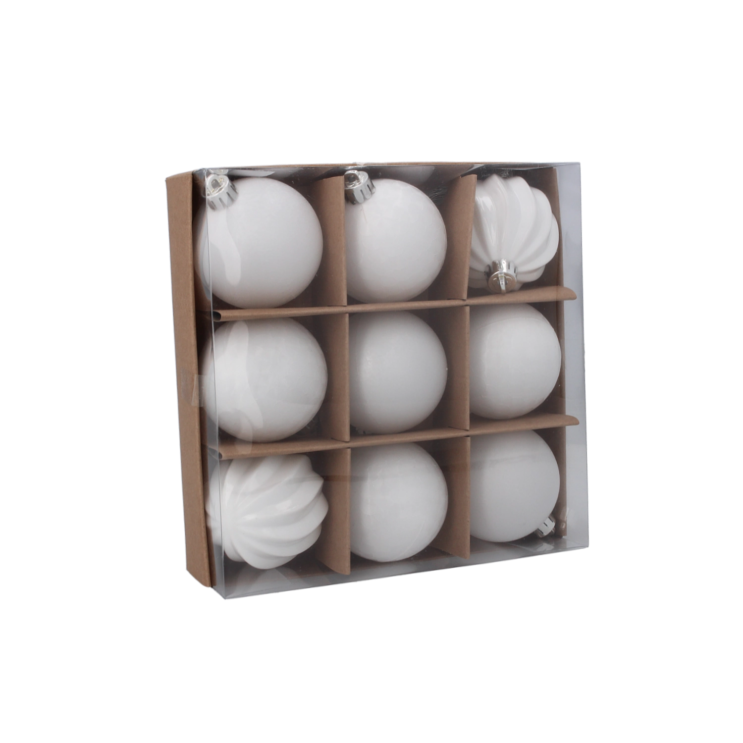 Opakowanie zawiera 9 sztuk do równomiernego rozmieszczenia na średniej wielkości choince. Jednolita biel umożliwia łatwe dopasowanie do innych dekoracji, łańcuchów świetlnych i wstążek. Idealne także do DIY – możesz je wykończyć brokatem, wstążkami lub napisami.