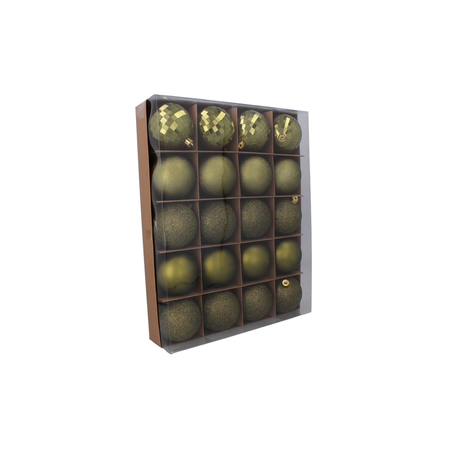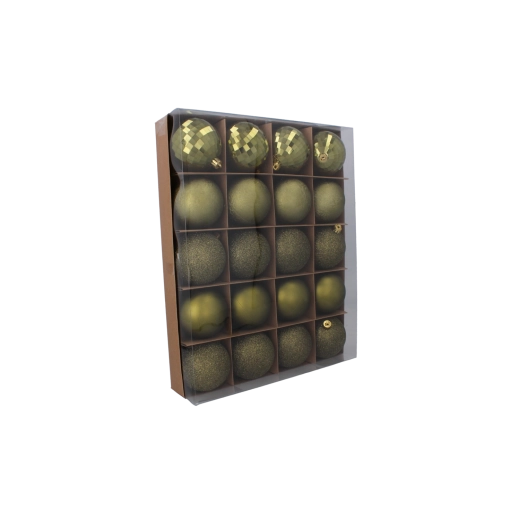 Ten uniwersalny zestaw 20 sztuk oferuje stylowy miks faktur, dzięki któremu z łatwością stworzysz wizualnie urozmaiconą, a jednocześnie spójną świąteczną aranżację. Połączenie kolorów oliwkowego, miedzianego i grafitowego wygląda nowocześnie i ponadczasowo – pasuje zarówno do klasycznych, jak i minimalistycznych wnętrz.