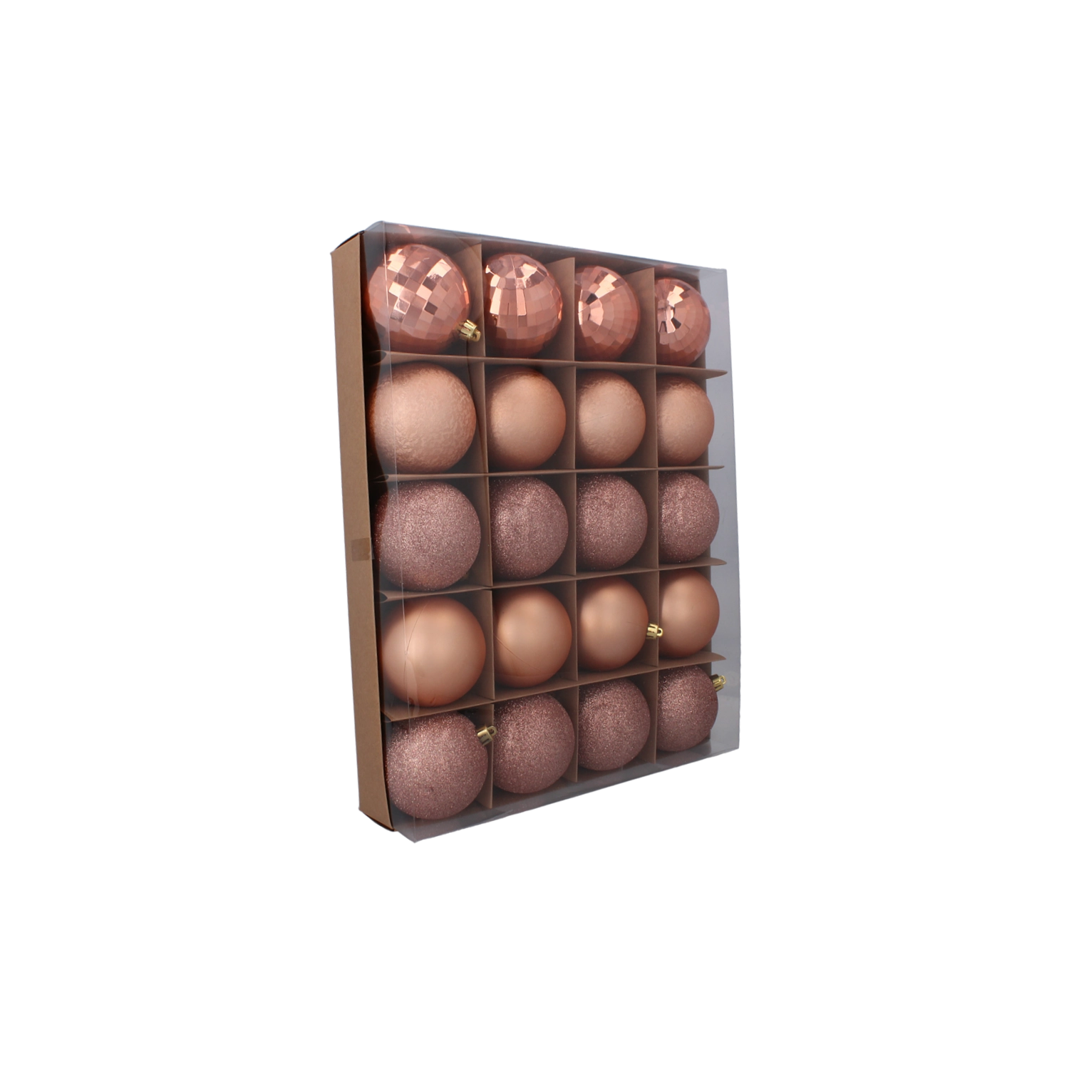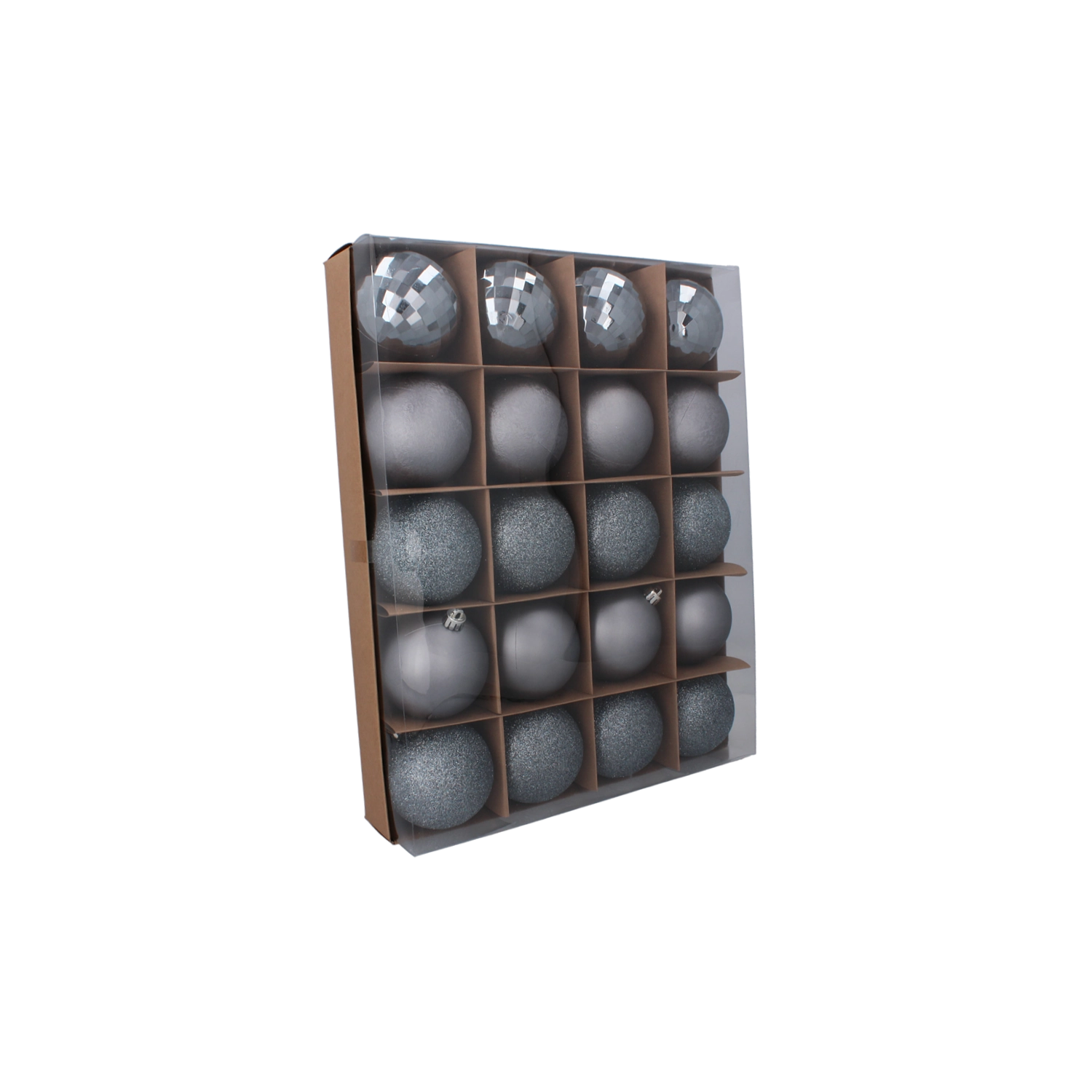 W zestawie znajduje się 8 bombek matowych dla stonowanej elegancji, 4 żebrowane (o wyraźniejszej strukturze) dla efektu trójwymiarowości oraz 8 błyszczących dla blasku i refleksów światła. Każda ozdoba wyposażona jest w metalowe oczko ułatwiające zawieszenie na haczyku lub wstążce.