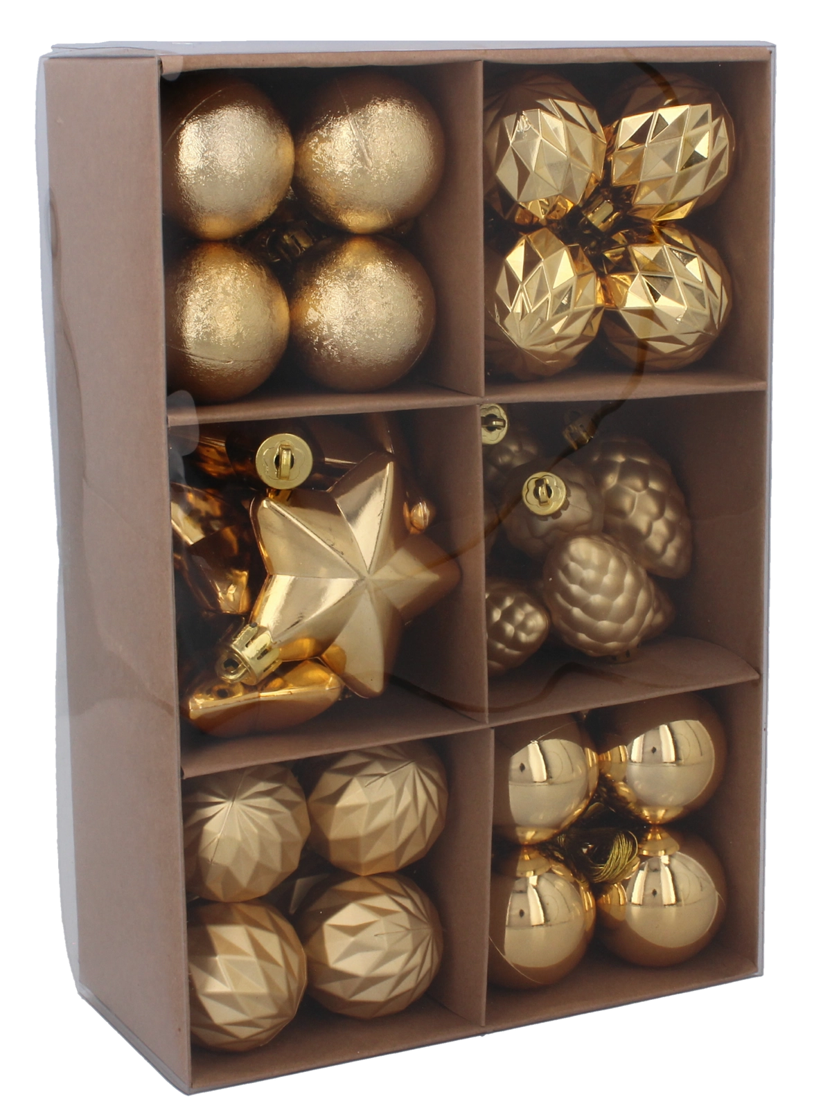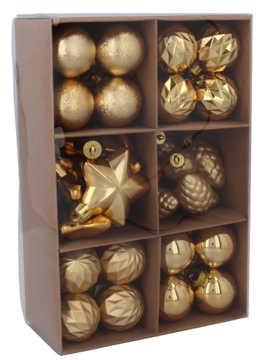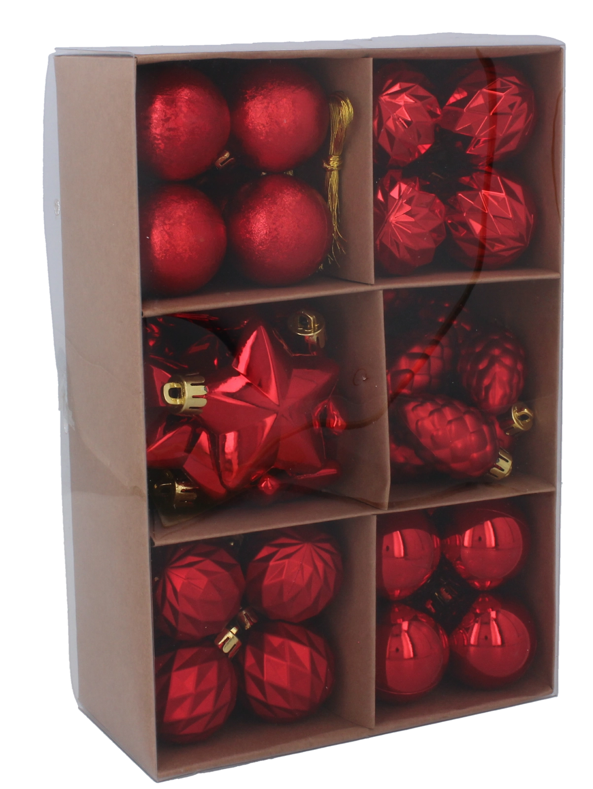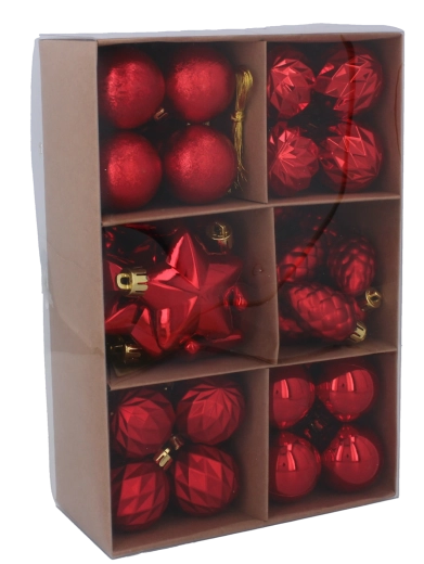 Ten bogaty zestaw oferuje starannie dobrane kształty i wykończenia – od gładkich, wysoko błyszczących bombek po fazowane i strukturyzowane ozdoby, gwiazdy i szyszki. Dzięki przemyślanemu połączeniu czerwieni, złota i srebra z łatwością dopasujesz dekoracje do pozostałych ozdób i stworzysz ponadczasową, świąteczną atmosferę.
