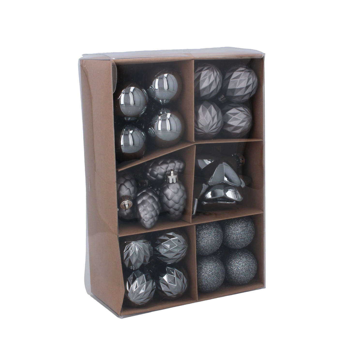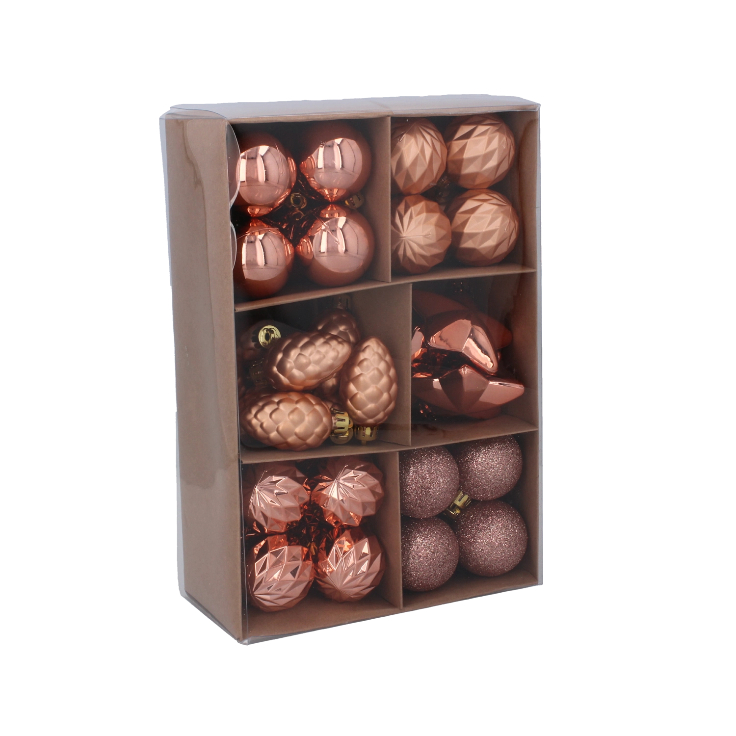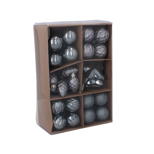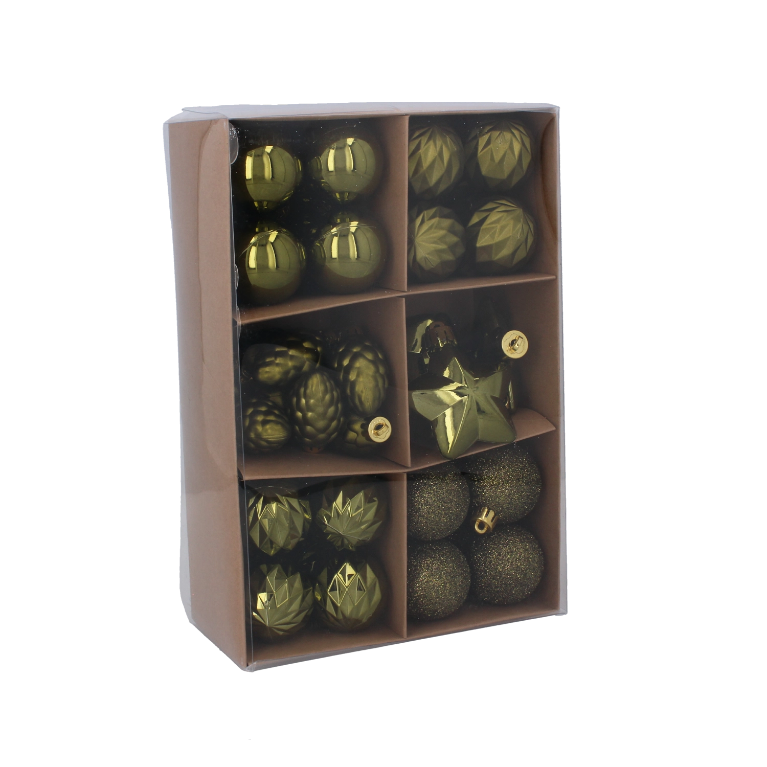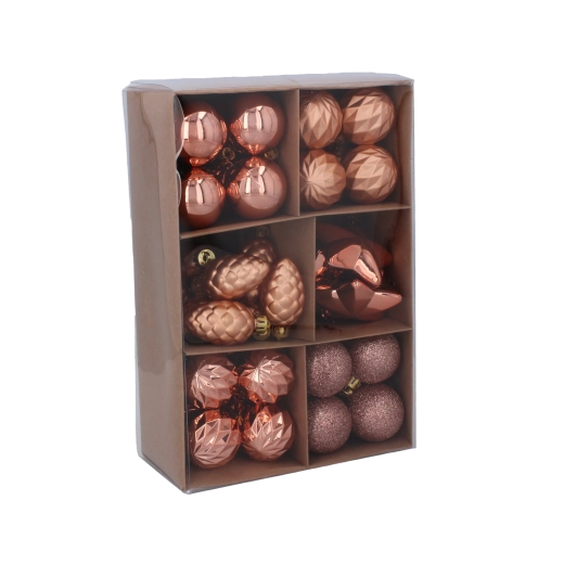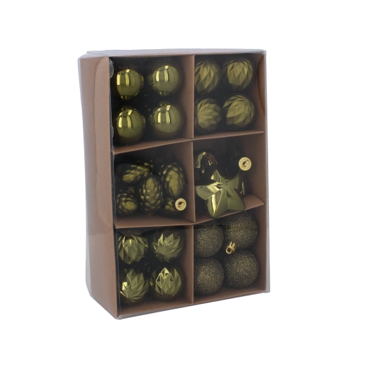 Ten kompleksowy zestaw obejmuje miks bombek, szyszek i gwiazd o średnicach 4–6 cm. Połączenie kolorów oliwkowego, miedzianego i grafitowego nadaje modny metaliczny charakter, który pasuje zarówno do nowoczesnych, jak i klasycznych wnętrz. Różne wykończenia pięknie odbijają światło, dodając choince głębi i blasku.