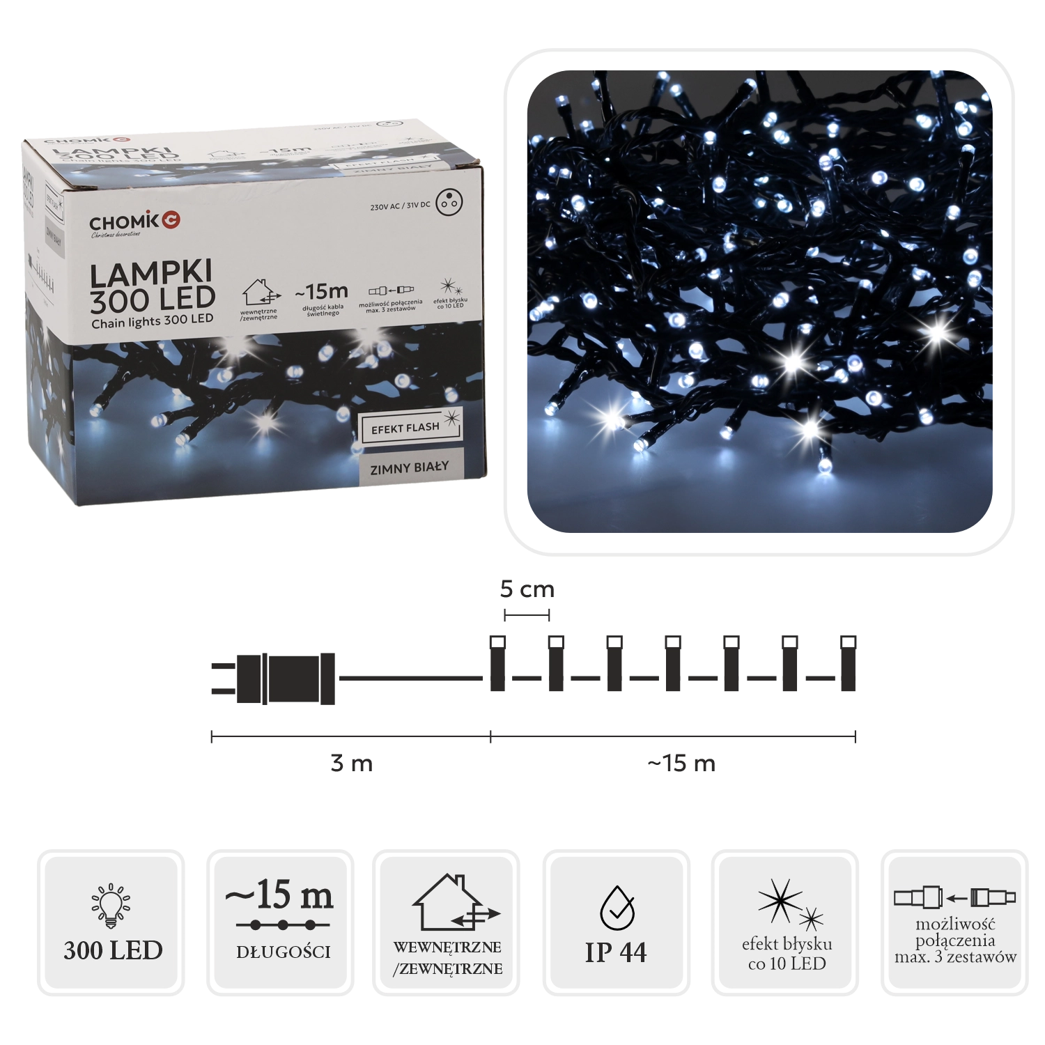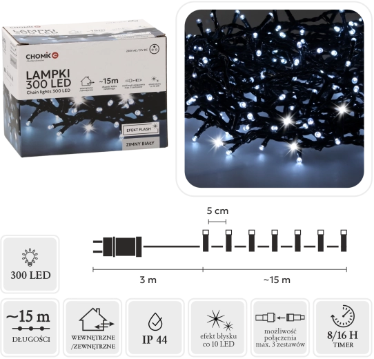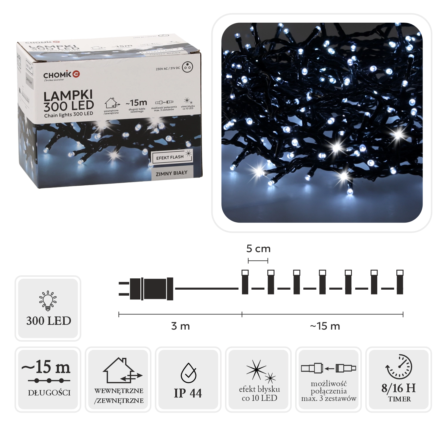 Stwórz świąteczną atmosferę dzięki łańcuchowi świetlnemu LED o długości do 18 m z 300 diodami w odcieniu zimnej bieli, uzupełnionym o efekt flash. Łańcuch oferuje ciągłe świecenie i miganie, programator z pamięcią i timerem 8/16 h, nadaje się do wnętrz i na zewnątrz (IP44), a dzięki zielonej izolacji doskonale wtapia się w gałęzie drzew.