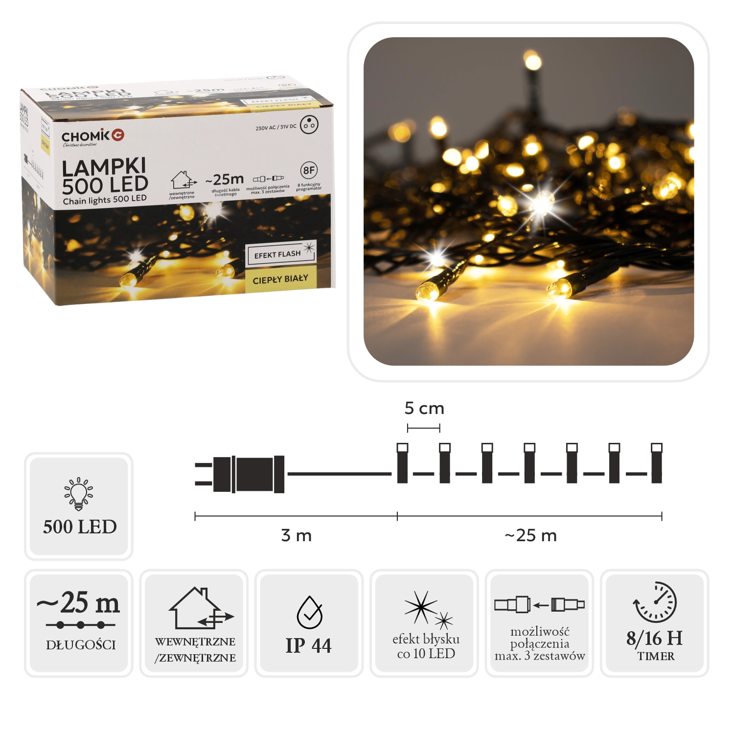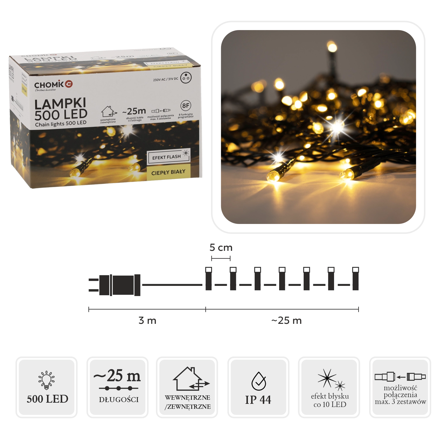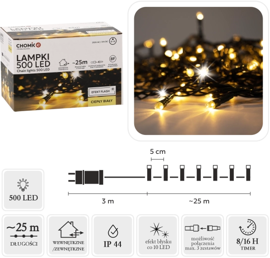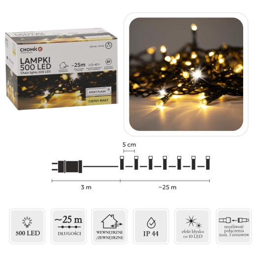 Rozświetl swój dom i ogród 28‑metrowym łańcuchem LED z 500 diodami LED, świecącymi ciepłą bielą z efektownym chłodnym „flash” błyskiem. Dzięki IP44, programatorowi z pamięcią i timerowi 8/16 h oraz możliwości połączenia aż 3 łańcuchów montaż jest łatwy, a rezultat imponujący.