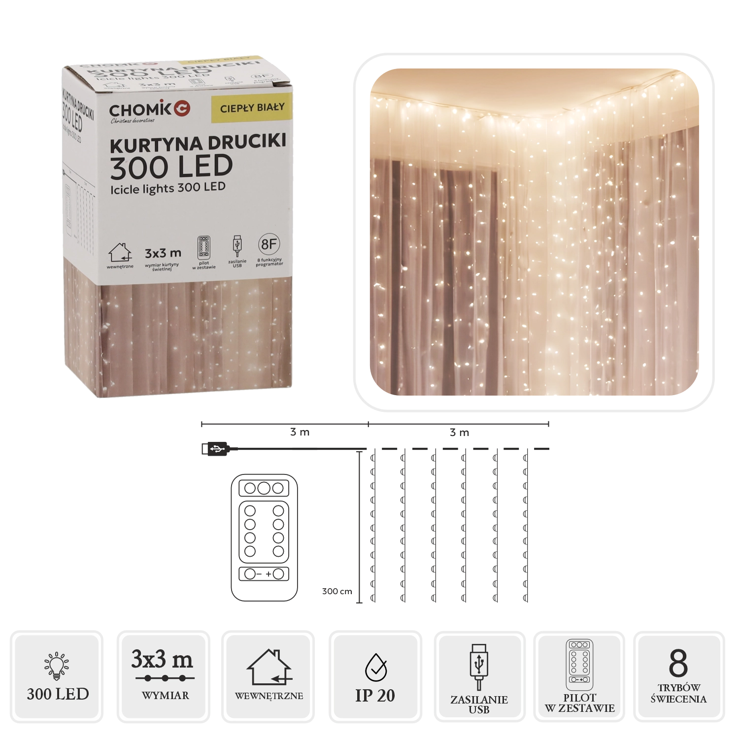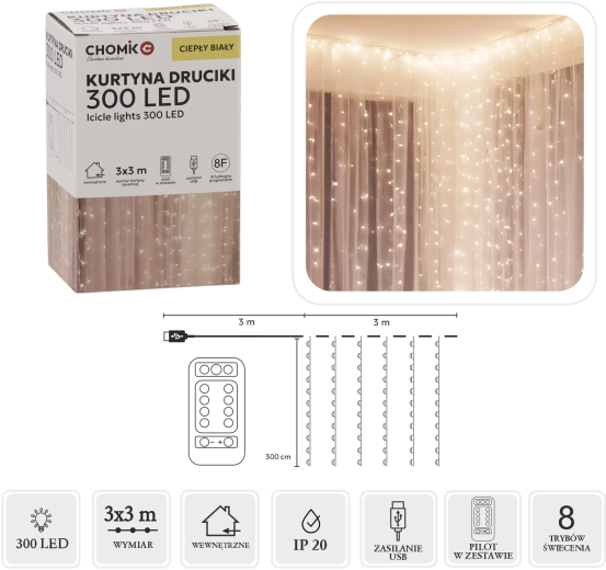 Stwórz magiczną atmosferę w domu i na zewnątrz dzięki świetlnej kurtynie o wymiarach 3 × 3 m z aż 300 mikro LED w ciepłej bieli. Praktyczne zasilanie USB, pilot oraz 8 trybów świecenia pozwolą łatwo dobrać idealny nastrój na każdą okazję. Elegancki srebrny drut subtelnie wtapia się w dekorację i podkreśla nowoczesny wygląd.