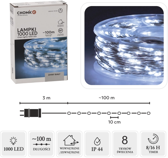 Ultradługi łańcuch LED na szpuli zapewnia wyrazisty efekt świetlny na całej długości 100 metrów. Gęste rozmieszczenie diod co 10 cm tworzy ciągłe, jasne i równomierne oświetlenie w odcieniu zimnej bieli. Dzięki klasie IP44 nadaje się do użytku wewnętrznego i zewnętrznego, a srebrny, dyskretny przewód łatwo wkomponowuje się w każdą aranżację.