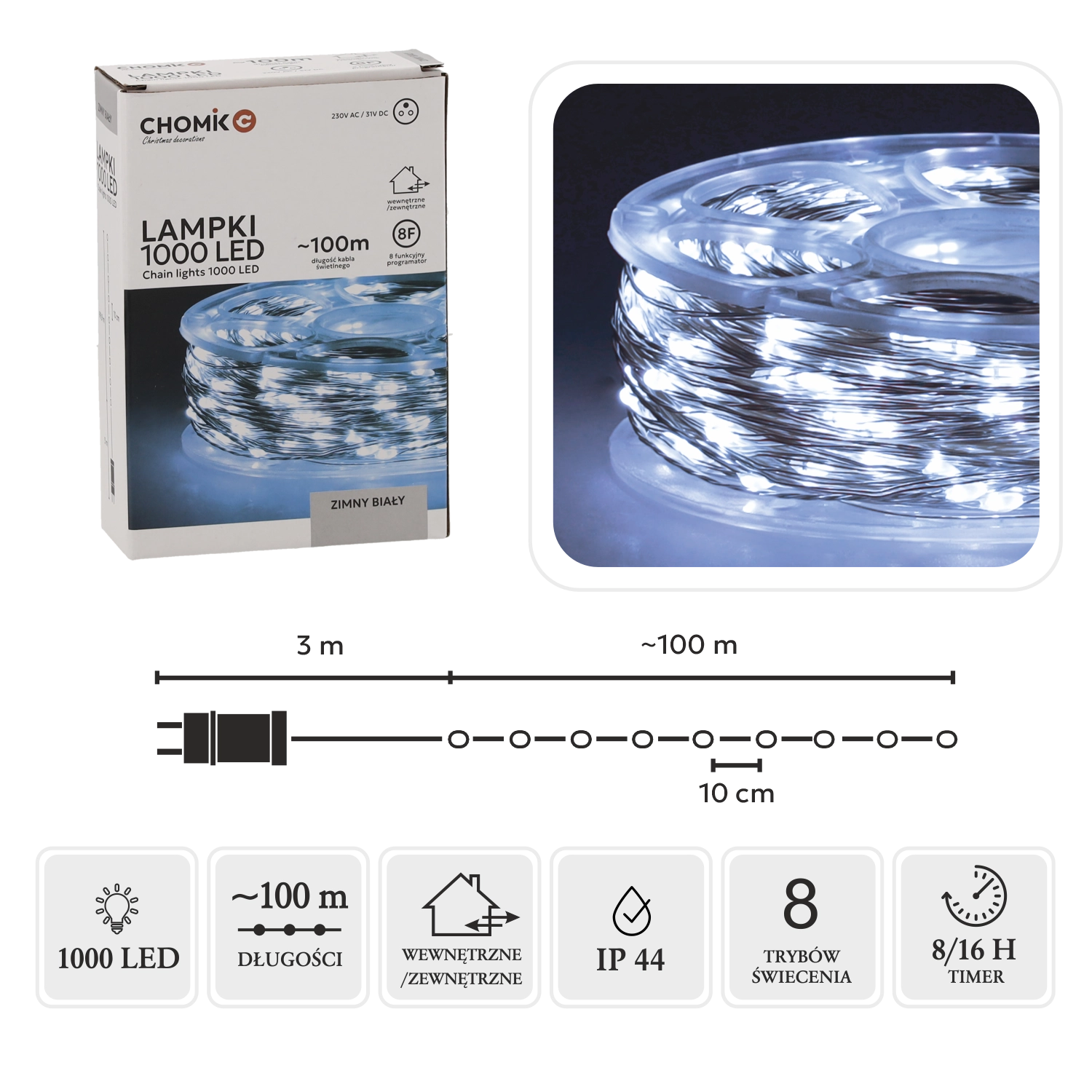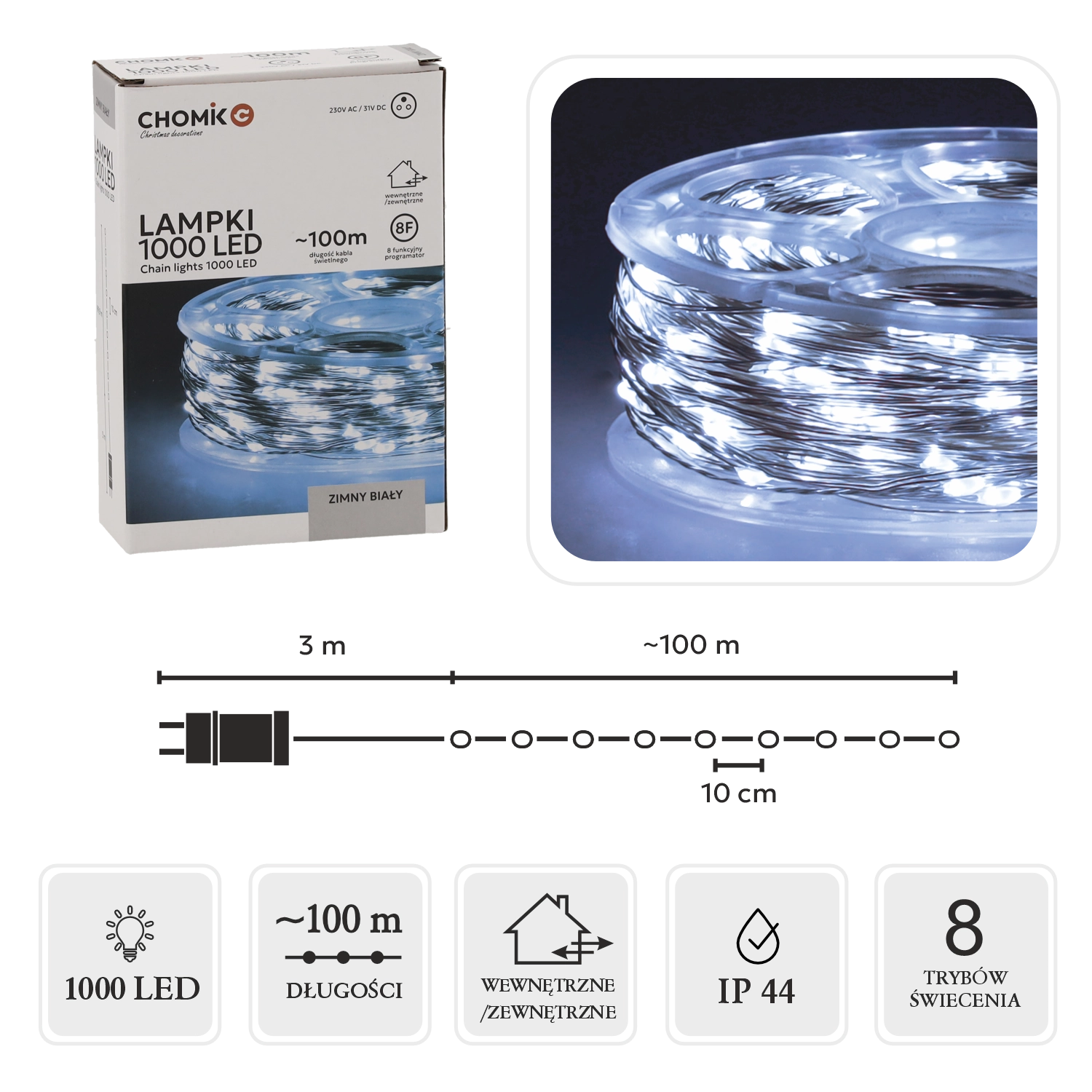 Rozświetl swój dom lub ogród wyjątkowo długim łańcuchem świetlnym o długości 100 m z aż 1000 diodami LED w zimnej bieli. Dzięki programatorowi z pamięcią i timerem 8/16 h, klasie szczelności IP44 oraz cienkiemu srebrnemu przewodowi idealnie sprawdzi się jako dekoracja świąteczna, na przyjęcia oraz całorocznie – w pomieszczeniach i na zewnątrz.