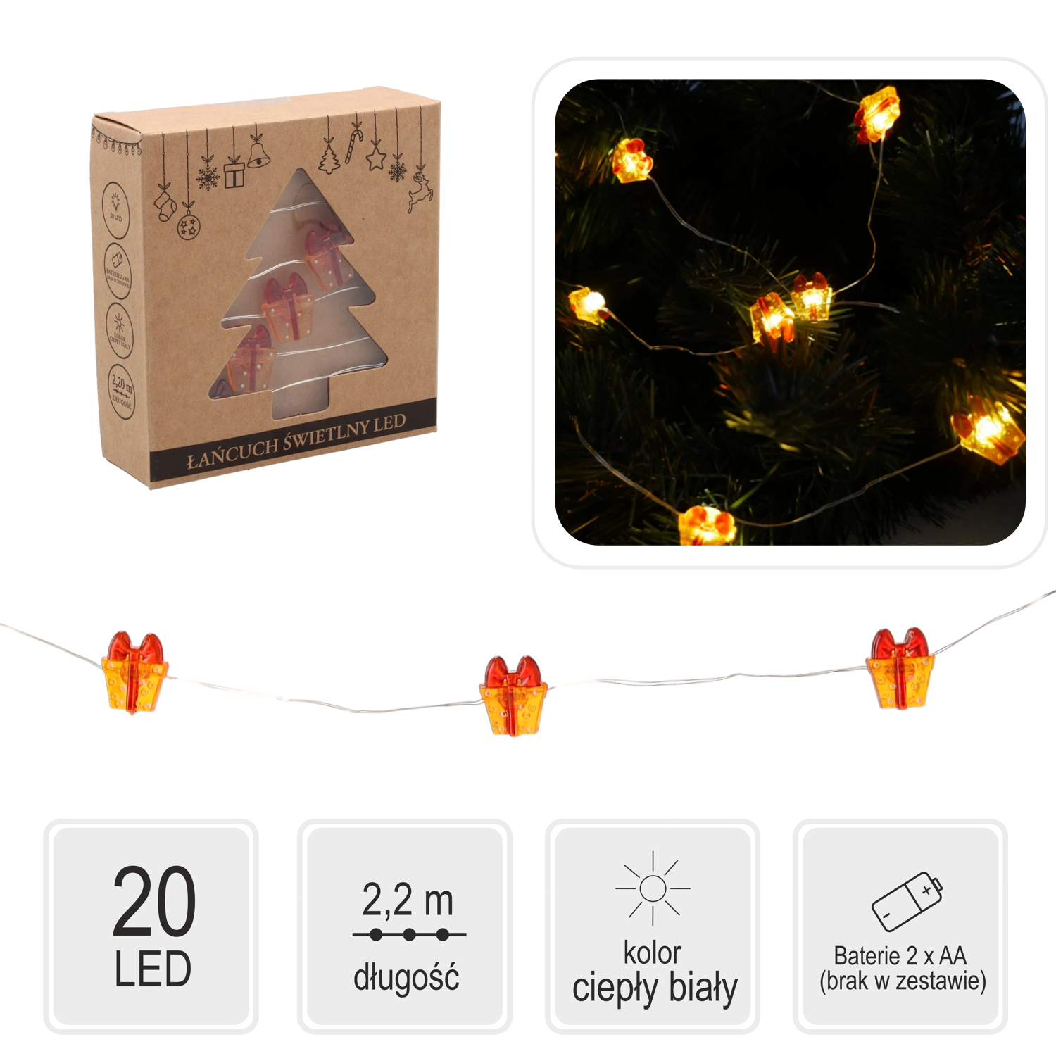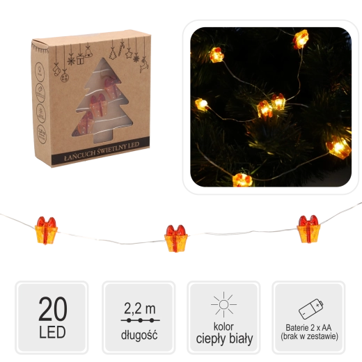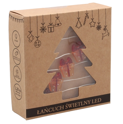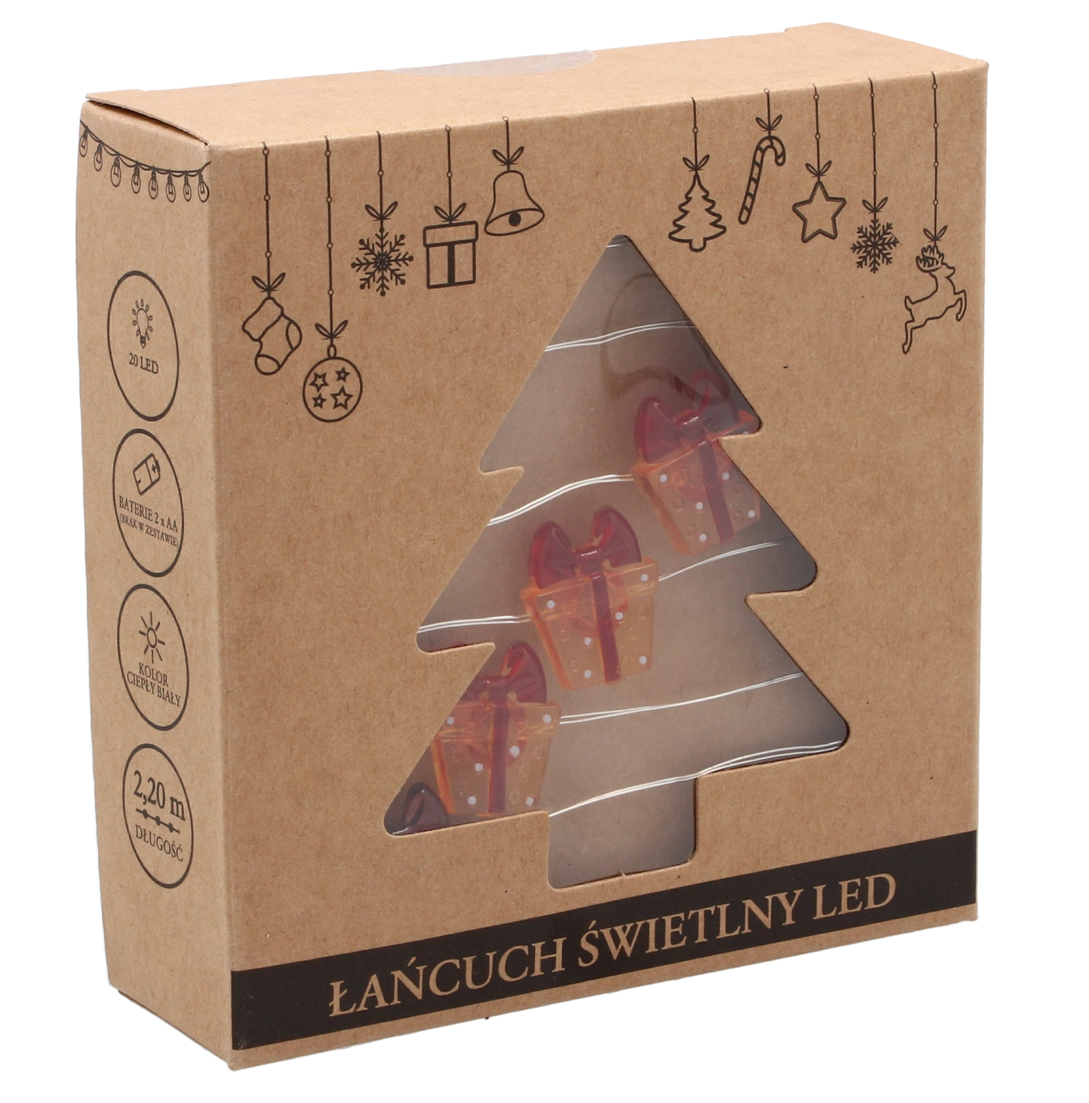 Rozświetl dom świąteczną atmosferą dzięki łańcuchowi świetlnemu z motywem prezentów. 20 ciepłych białych diod LED tworzy przytulne, nastrojowe światło, a zasilanie bateryjne pozwala dekorować gdziekolwiek – na choince, oknie, półce czy w wieńcu.