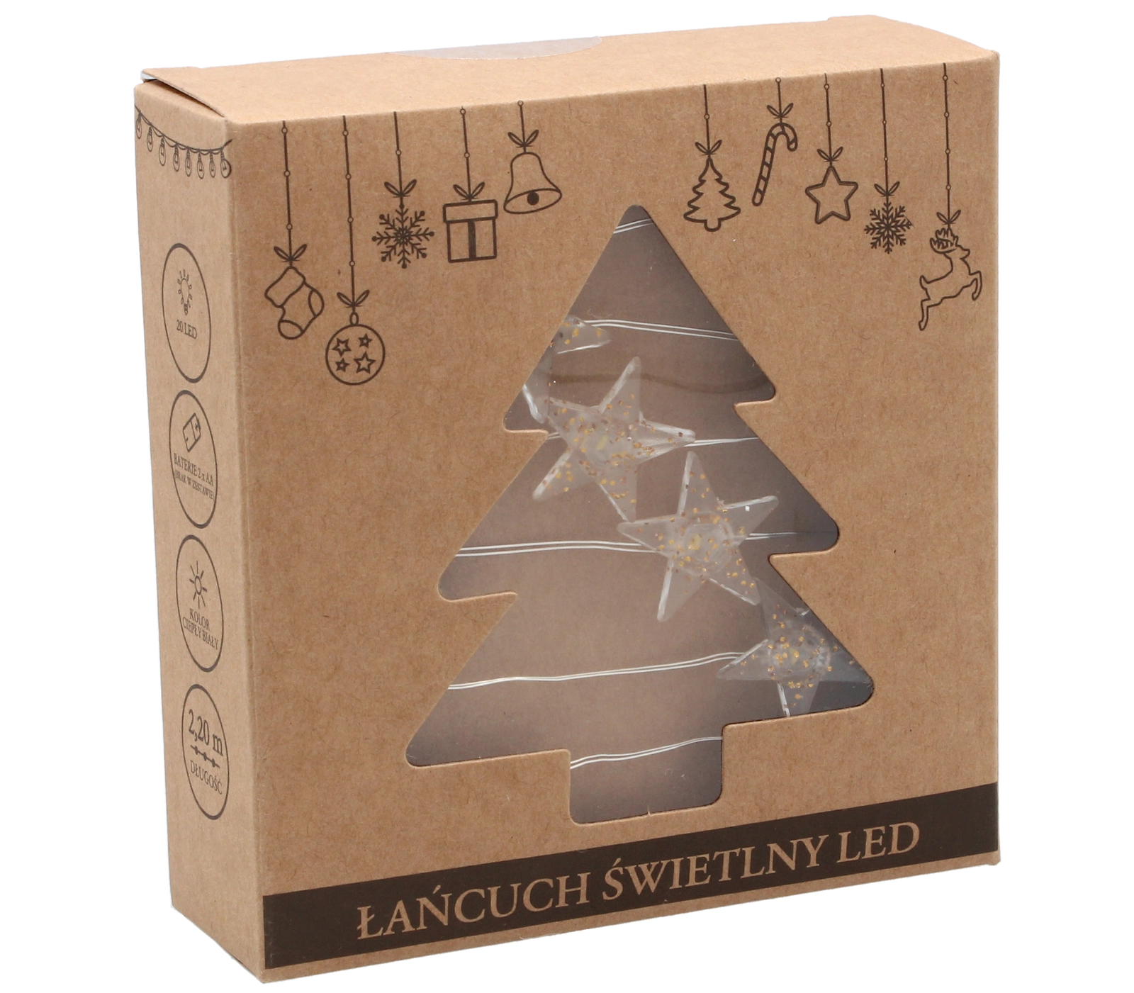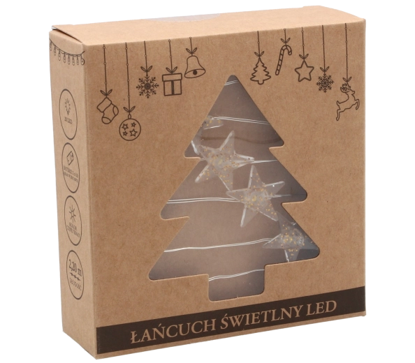 Stylowy świetlny łańcuch z motywem gwiazdek rozświetli każde wnętrze. Ciepłe białe światło działa przyjemnie i wprowadza uroczysty nastrój, niezależnie od tego, czy użyjesz go do dekoracji świątecznych, w aranżacjach na komodzie, czy jako subtelny akcent w oknie.