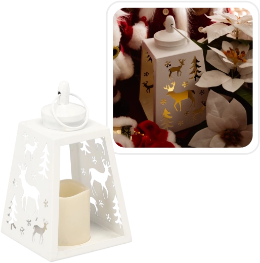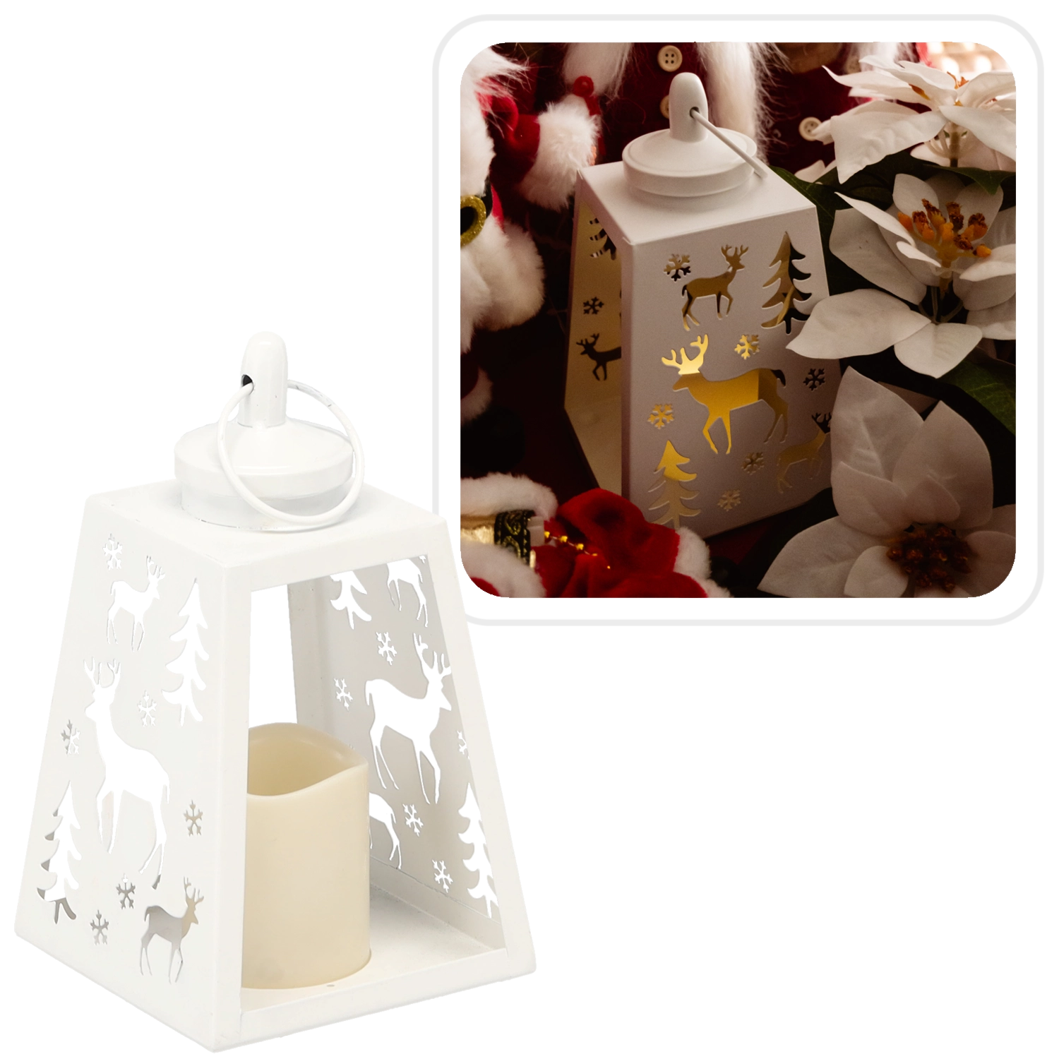 Stwórz przyjemną atmosferę bez dymu i kapiącego wosku. Ten biały metalowy lampion LED ze stylowym motywem renifera to świetny wybór na zimowe i całoroczne dekoracje. Plastikowa świeczka wewnątrz emituje delikatne ciepłe białe światło, które wprowadza spokój i komfort.