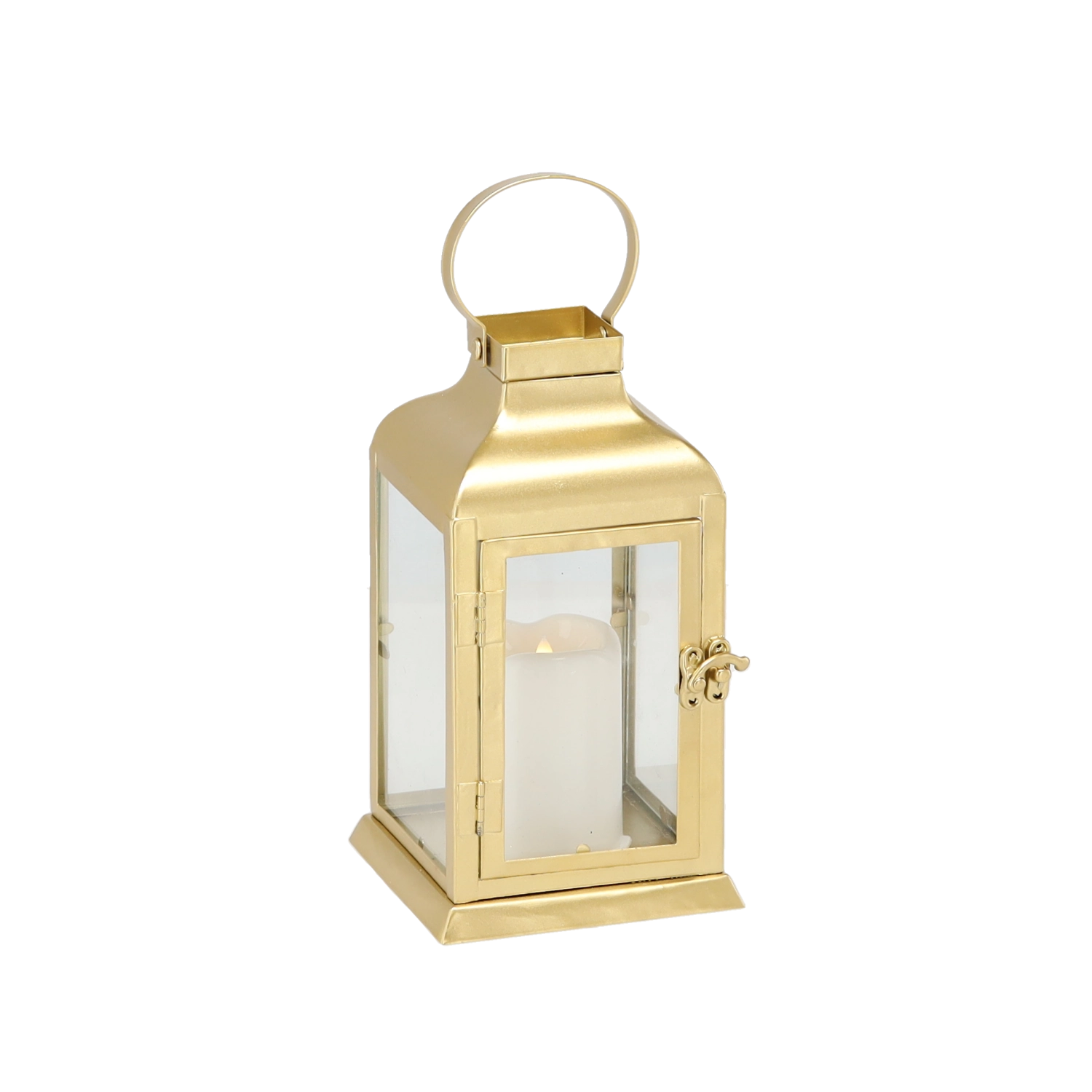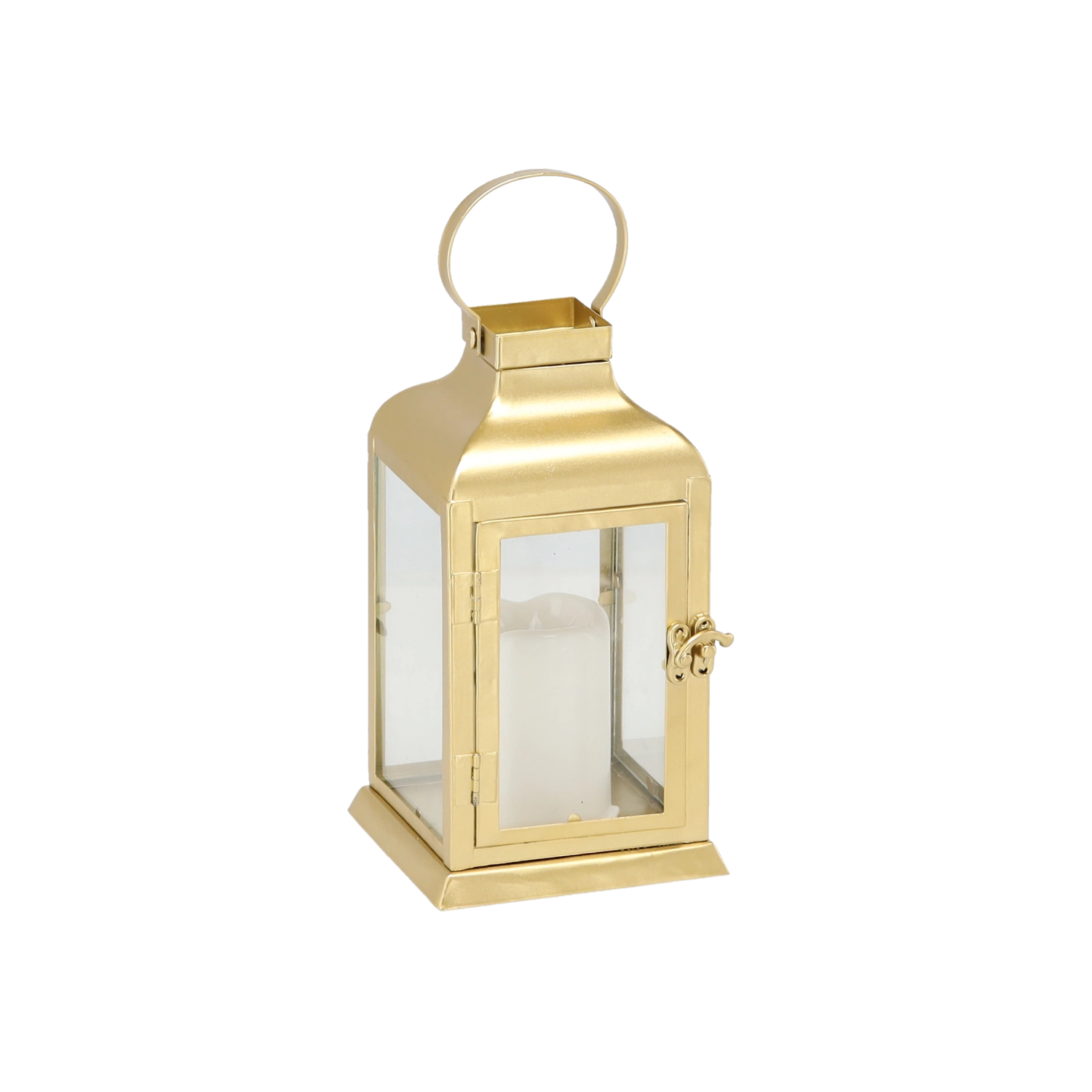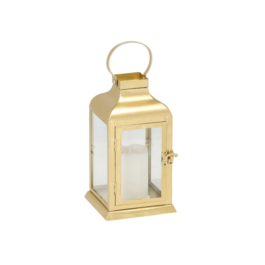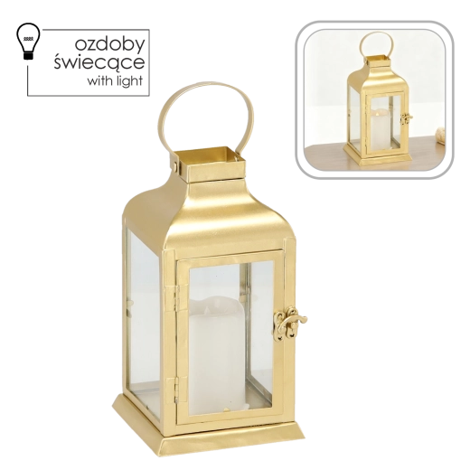Elegancki złoty lampion łączy ponadczasową metalową ramę z przezroczystymi szklanymi panelami i bezpieczną „świecą” LED. Daje ciepłe, migoczące światło bez ryzyka otwartego płomienia – doskonały do salonu, przedpokoju, na balkon czy odświętny stół.