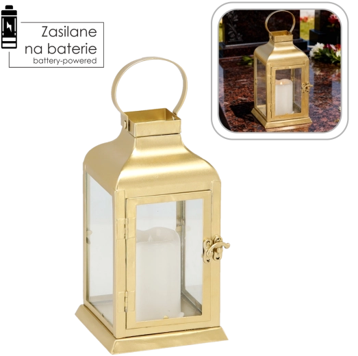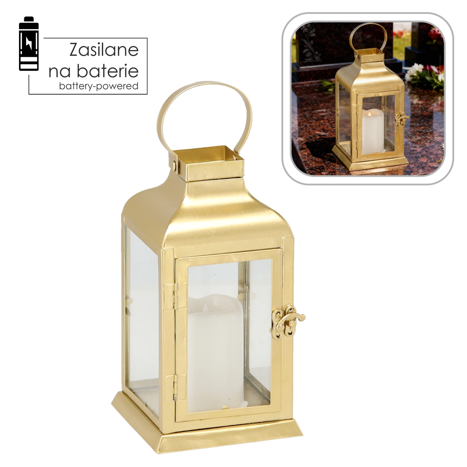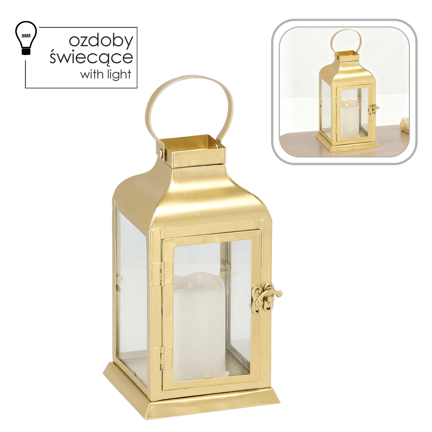 Stylowy złoty metalowy lampion z wbudowaną świecą LED tworzy przytulną atmosferę bez dymu i wosku. Dzięki zasilaniu bateryjnemu idealnie sprawdzi się we wnętrzach i osłoniętych przestrzeniach zewnętrznych, a jego szklane ścianki podkreślają ciepłe światło, doskonałe jako dekoracja świąteczna i całoroczna.