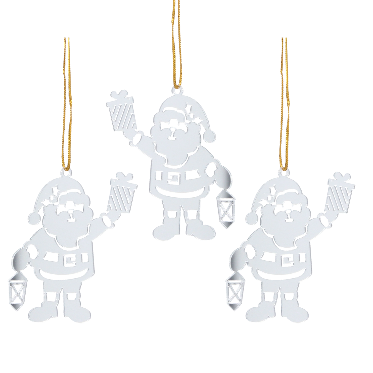 Zestaw trzech ozdób z klasycznym motywem Mikołaja zachwyca eleganckim srebrnym wykończeniem i gładkim połyskiem, który podkreśla przytulny świąteczny nastrój. Dzięki lekkiej i płaskiej konstrukcji zawiesisz je nawet na delikatniejszych gałązkach bez niepożądanego obciążenia.