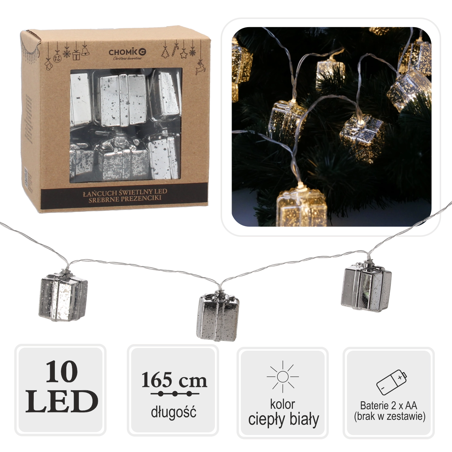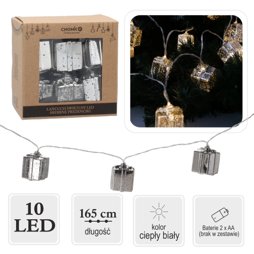 Stylowy łańcuch świetlny LED ze srebrnymi prezencikami i 10 ciepłymi białymi diodami wyczaruje przyjemną, świąteczną atmosferę w każdym wnętrzu. Dzięki zasilaniu bateryjnemu 2× AA masz swobodę rozmieszczenia bez kabli – na półce, lustrze, wieńcu czy mniejszej choince. Delikatne ciepłe światło podkreśli przytulność i elegancję Twoich dekoracji.