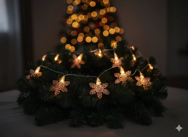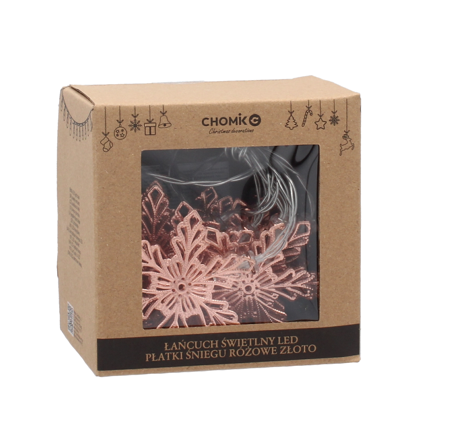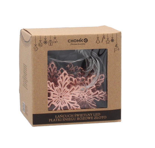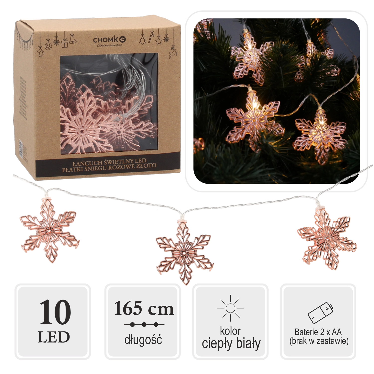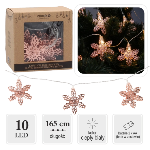 Stwórz zimowy nastrój z eleganckim łańcuchem świetlnym LED w kształcie płatków śniegu w odcieniu różowego złota. 10 ciepłobiałych diod LED wprowadzi przytulny, świąteczny klimat, a zasilanie bateryjne 2× AA zapewni maksymalną swobodę rozmieszczenia bez kabli.
