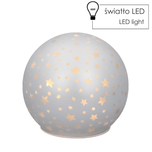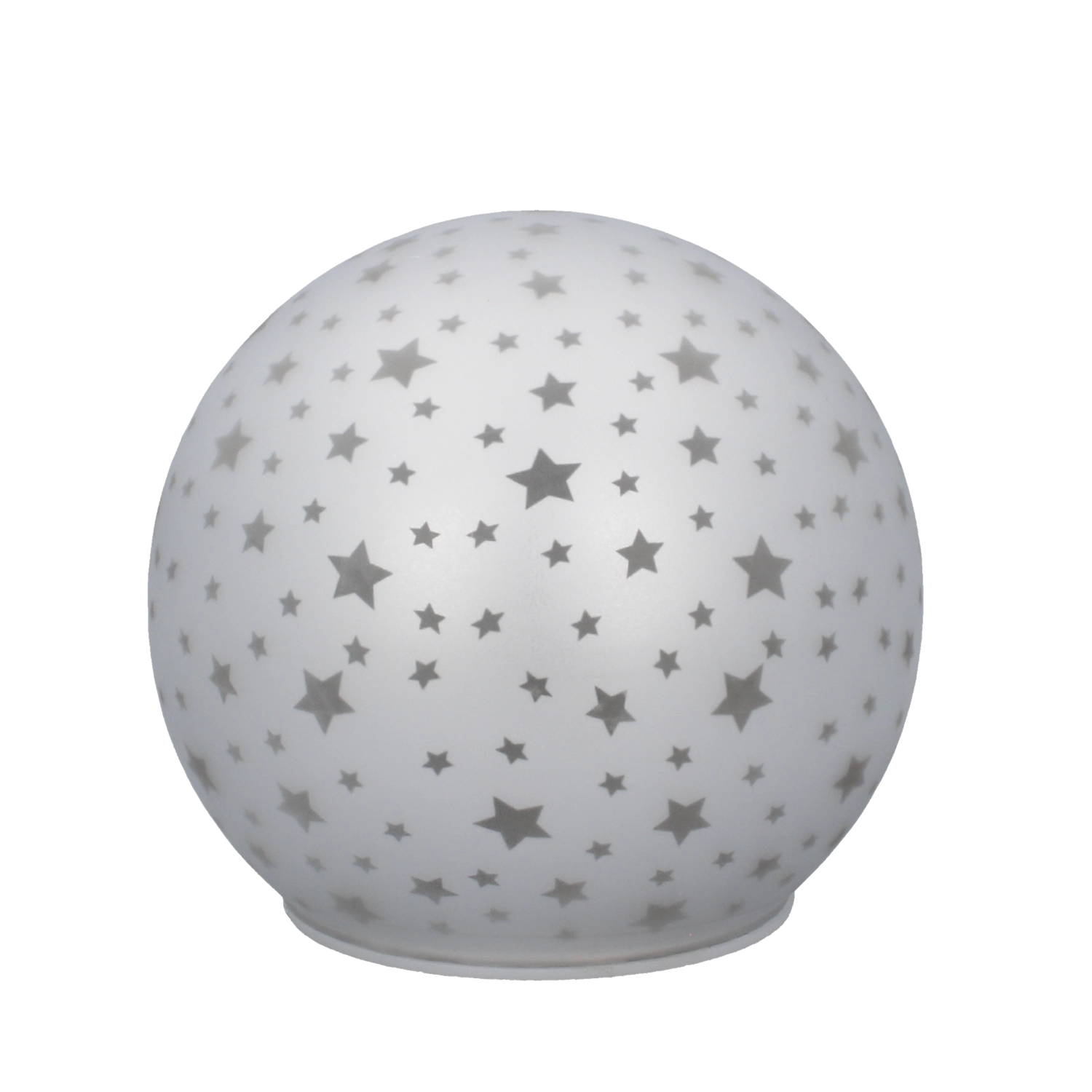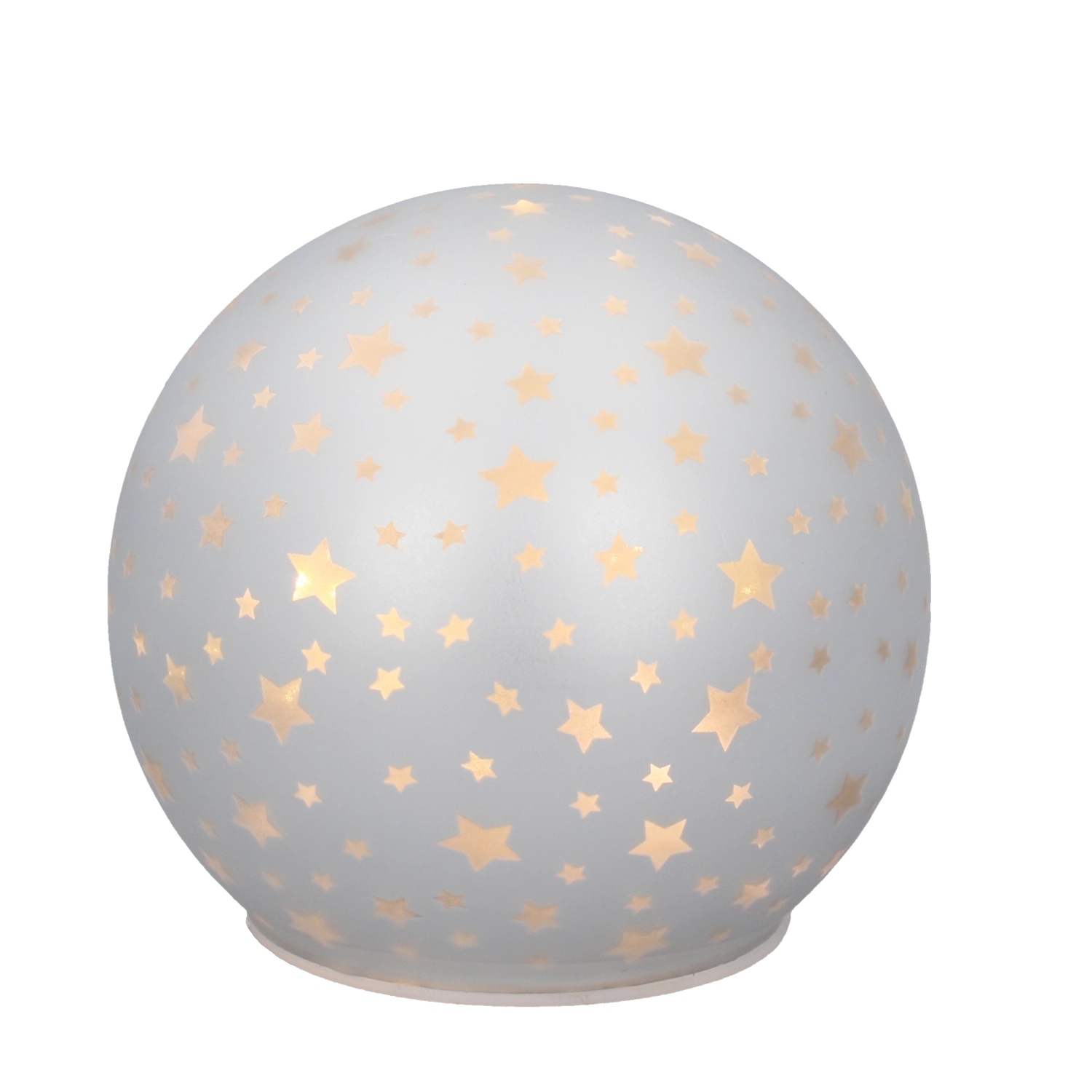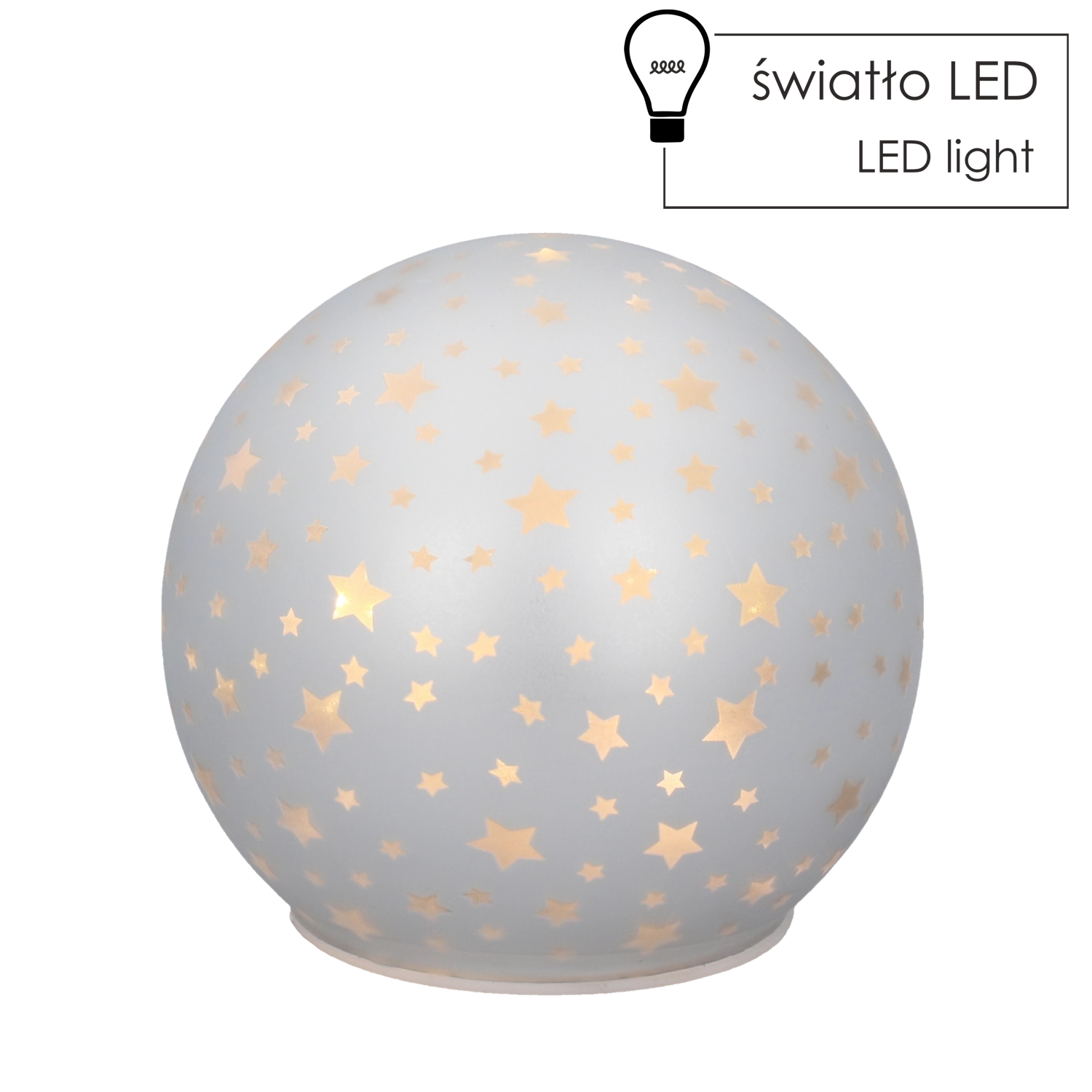 Ta dekoracyjna szklana kula z motywem gwiazd to stylowy dodatek, który wprowadza do każdego pokoju delikatne światło ambientowe. Zintegrowane diody LED oszczędzają energię i tworzą przyjemny efekt wizualny, doskonały do salonu, sypialni i pokoju dziecięcego.
