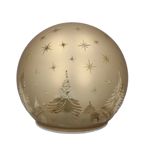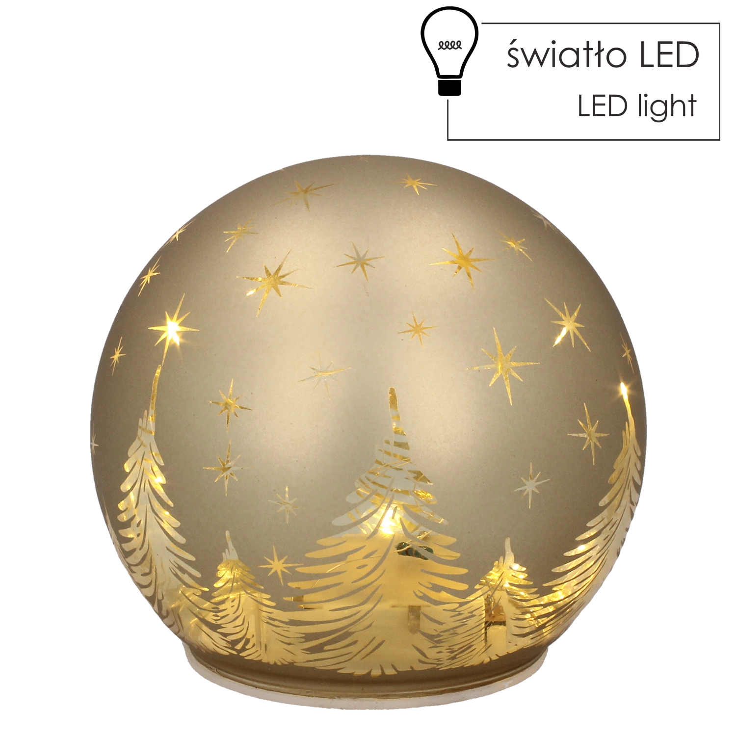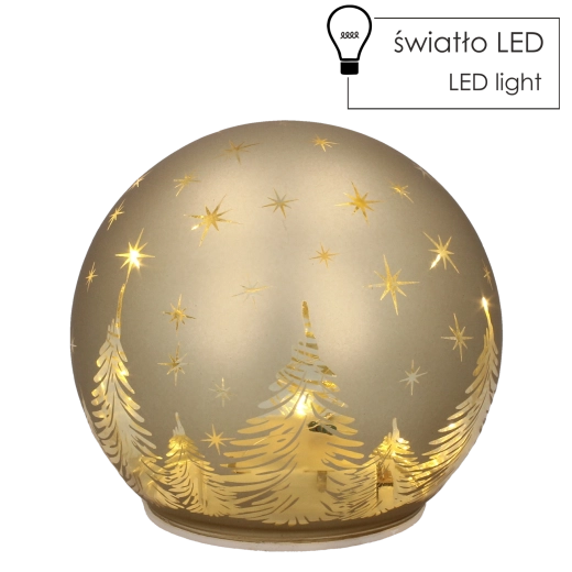 Elegancka szklana kula w luksusowym, złotym wykończeniu z wbudowanym oświetleniem LED wprowadzi do wnętrza ciepłą, odświętną atmosferę. Delikatne światło z efektem rozgwieżdżonego nieba tworzy przytulny klimat, a energooszczędne diody LED zapewniają długą żywotność bez zbędnego zużycia energii. Kompaktowe wymiary 12 × 11 cm ułatwiają ustawienie na stole, półce czy parapecie.