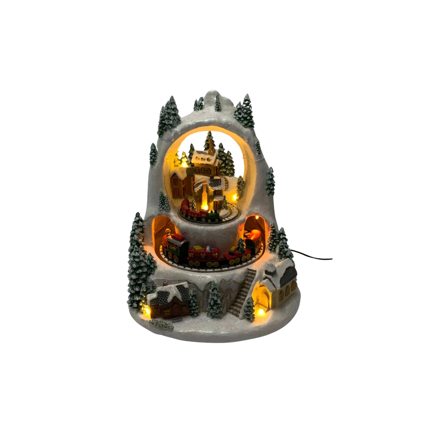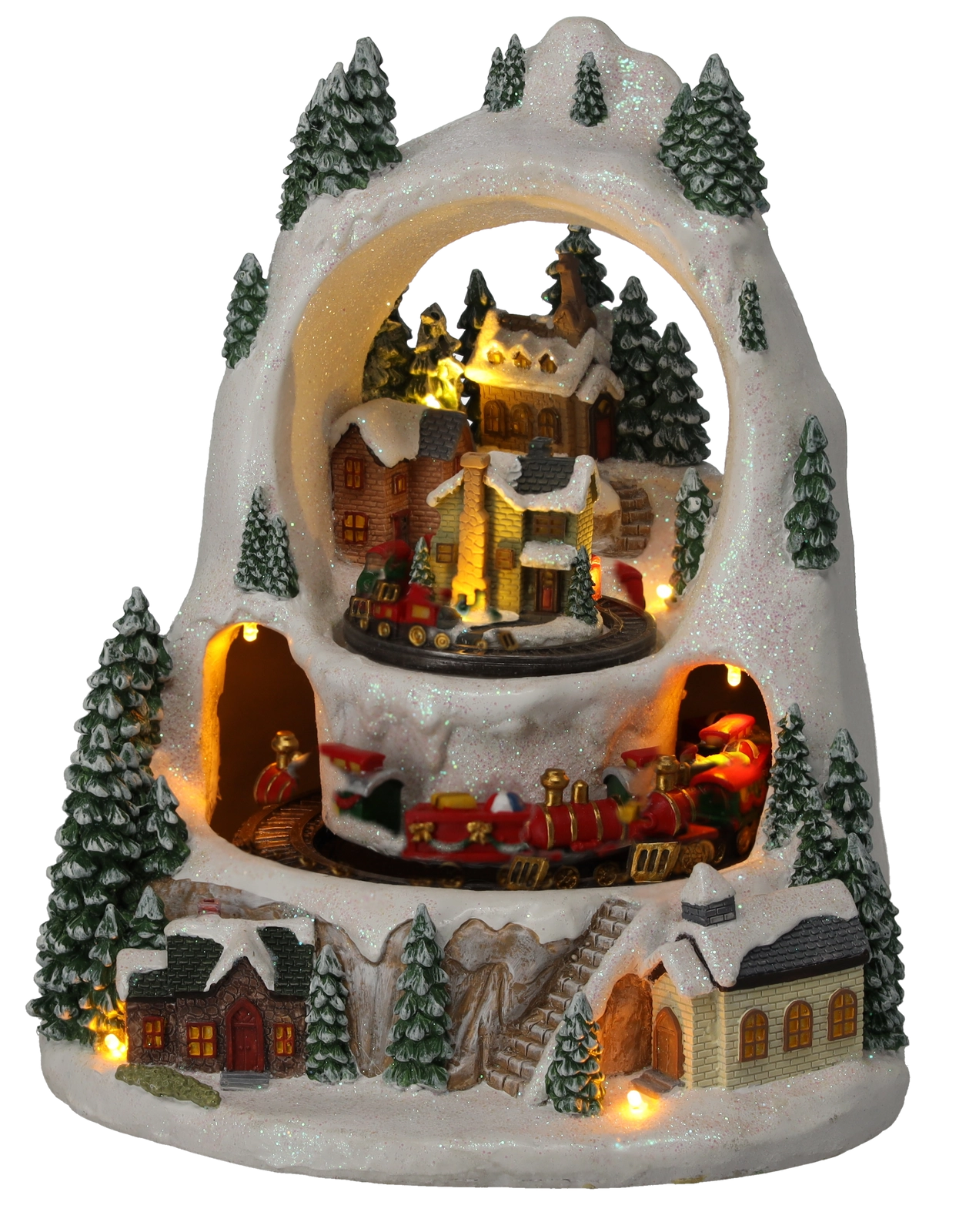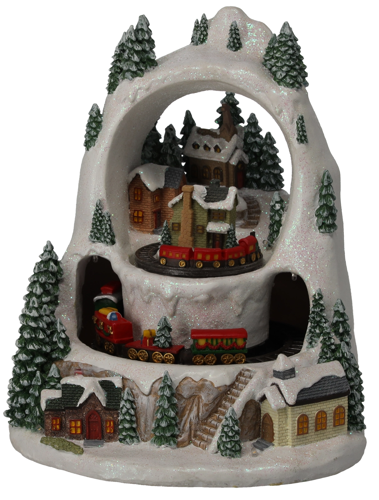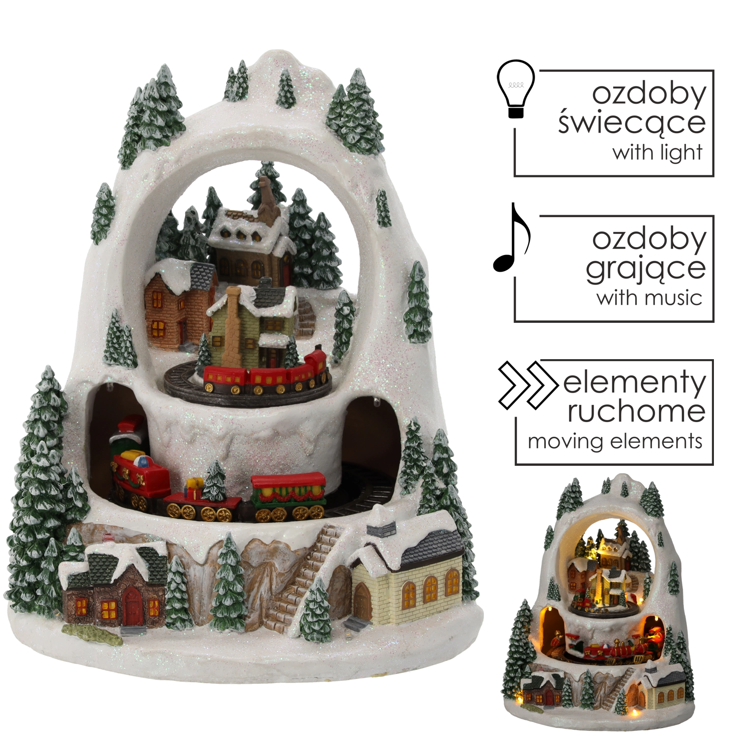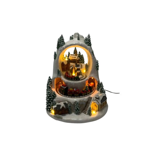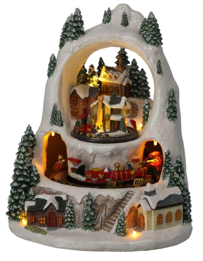 Stwórz w domu mały zimowy cud. Szczegółowo wykonana świąteczna wioska ze ośnieżonymi domkami i drzewami ożywa dzięki ruchowi pociągów na dwóch poziomach, przyjemnie ciepłemu oświetleniu LED oraz możliwości odtworzenia klasycznych świątecznych melodii. Wybieraj między trybem z dźwiękiem lub cichą pracą tylko ze światłem i animacją.