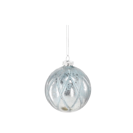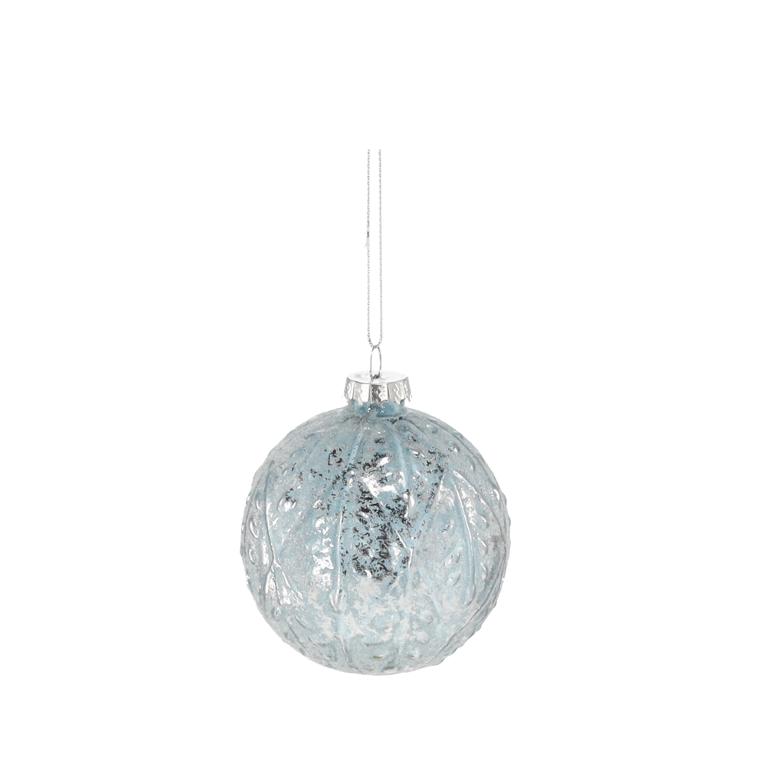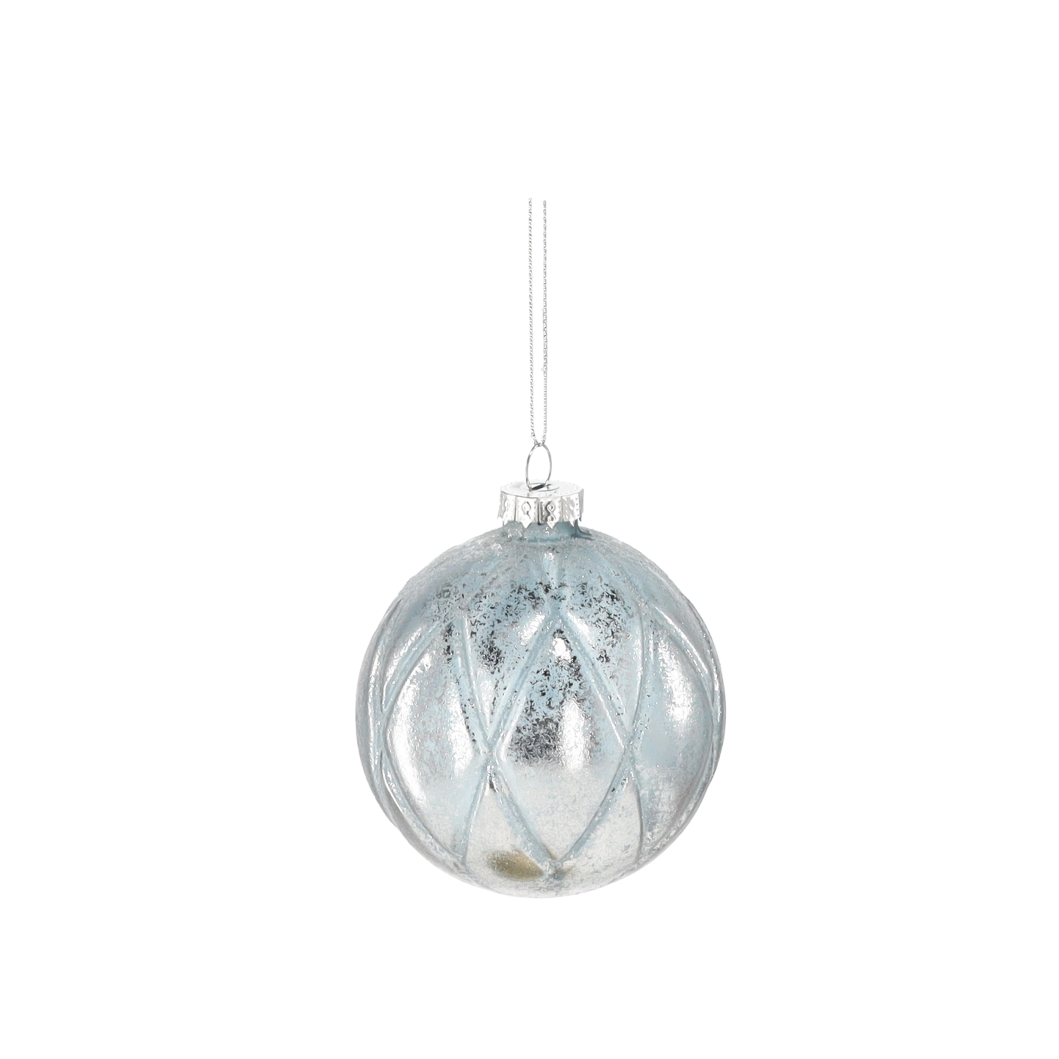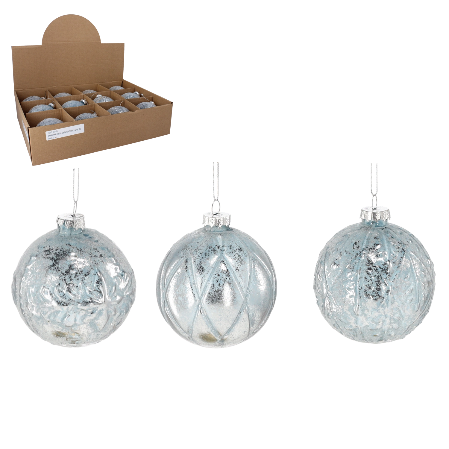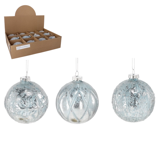 Zestaw 12 szklanych bombek w połączeniu koloru niebieskiego i srebrnego wnosi na choinkę efekt mroźnego połysku i subtelnego blasku. Ręczne zdobienie z różnorodnymi wzorami – od delikatnych reliefów po diamentowe struktury – gwarantuje niepowtarzalny wygląd każdej ozdoby oraz elegancką spójność całej dekoracji.