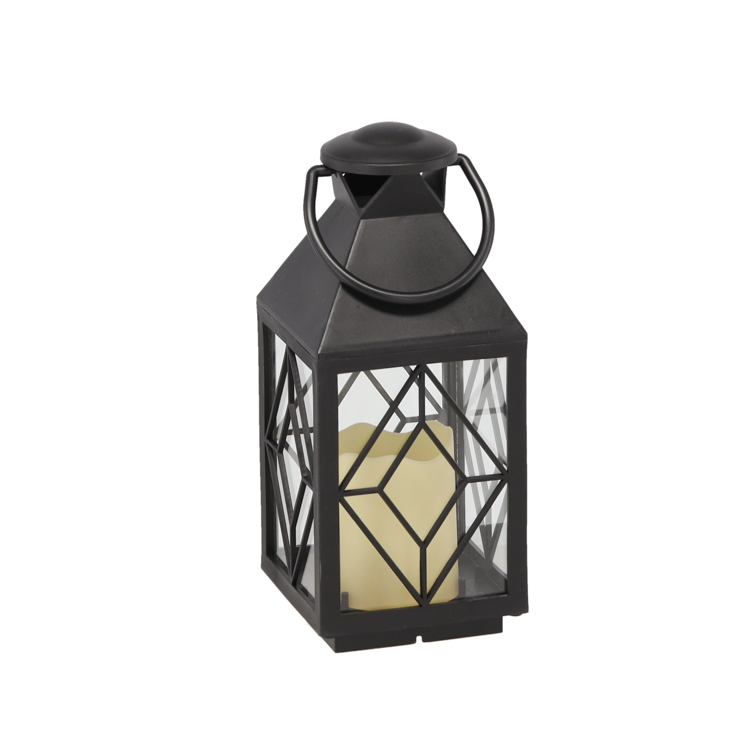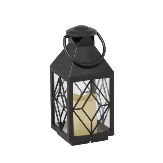 Czarny metalowy lampion ze szklanymi panelami i wzorem kratki zapewnia efektowne światło, które podkreśli każdy wystrój wnętrza i przestrzeni osłoniętej na zewnątrz. Zintegrowana lampka LED daje przyjemne ciepłe światło bez płomienia, dlatego idealnie sprawdzi się w domach z dziećmi lub zwierzętami.
