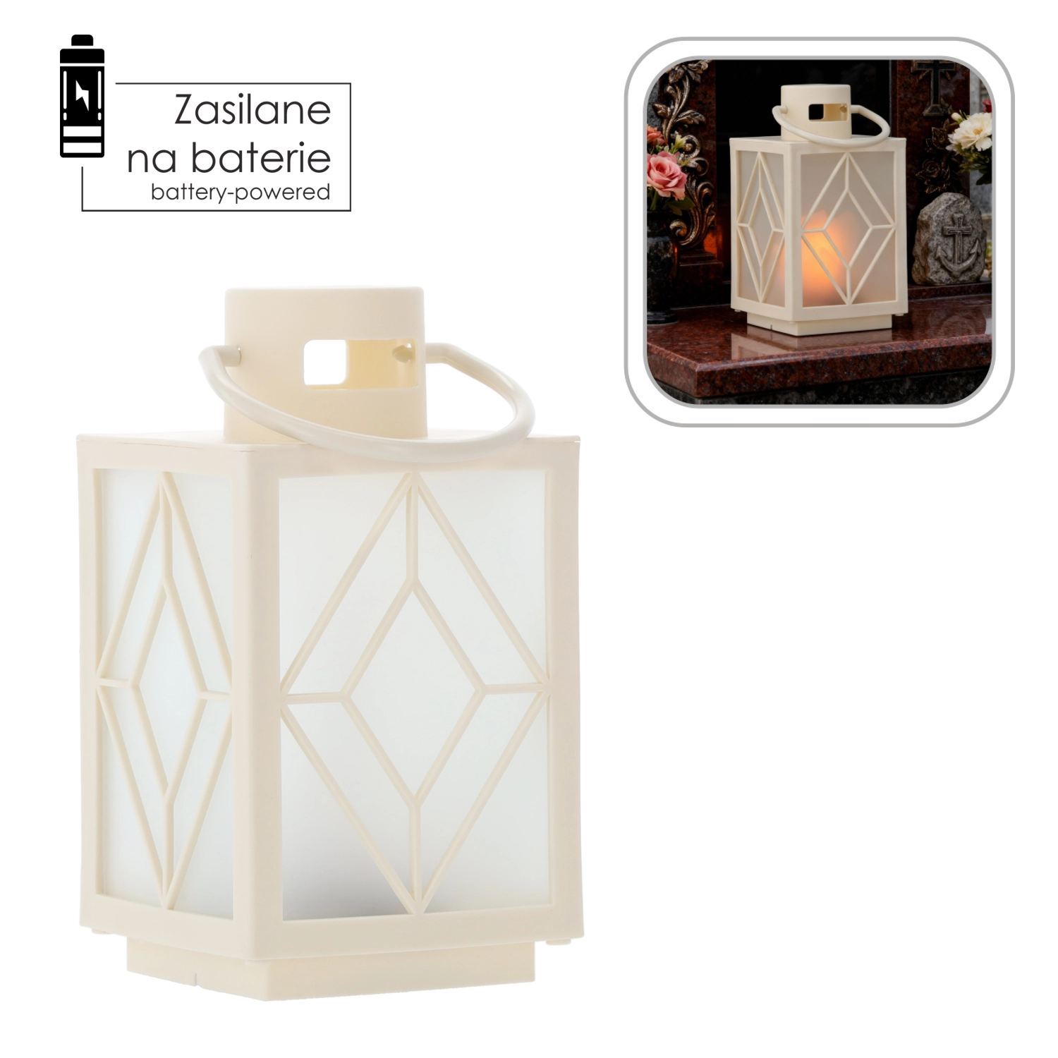 Dzięki zasilaniu na baterie lampion jest w pełni przenośny – z łatwością postawisz go na półce, tarasie czy nagrobku. Solidny uchwyt umożliwia zawieszenie i szybką zmianę miejsca według potrzeb.