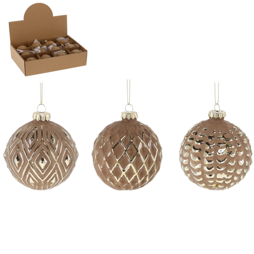 Dodaj swojej choince szyku dzięki brązowym szklanym bombkom zdobionym złotymi ornamentami. Każdy element jest starannie wykonany ze szkła i zdobiony tak, aby świetnie prezentował się w każdym świetle. Dzięki uniwersalnemu połączeniu kolorów bombki doskonale pasują zarówno do tradycyjnych, jak i nowoczesnych dekoracji.