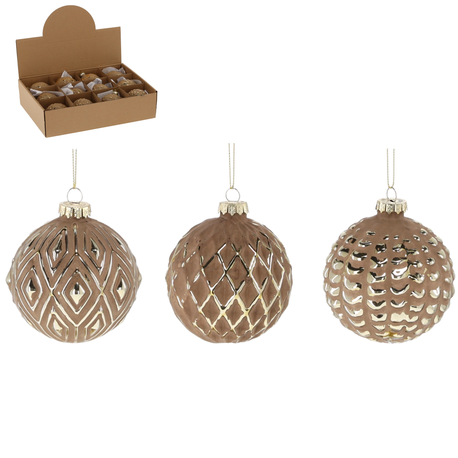 Zestaw 12 sztuk obejmuje różne wzory, które razem tworzą zbalansowaną i stylową całość. Matowa powierzchnia w połączeniu z błyszczącymi złotymi detalami prezentuje się elegancko i nadaje świątecznym ozdobom premiumowy charakter.