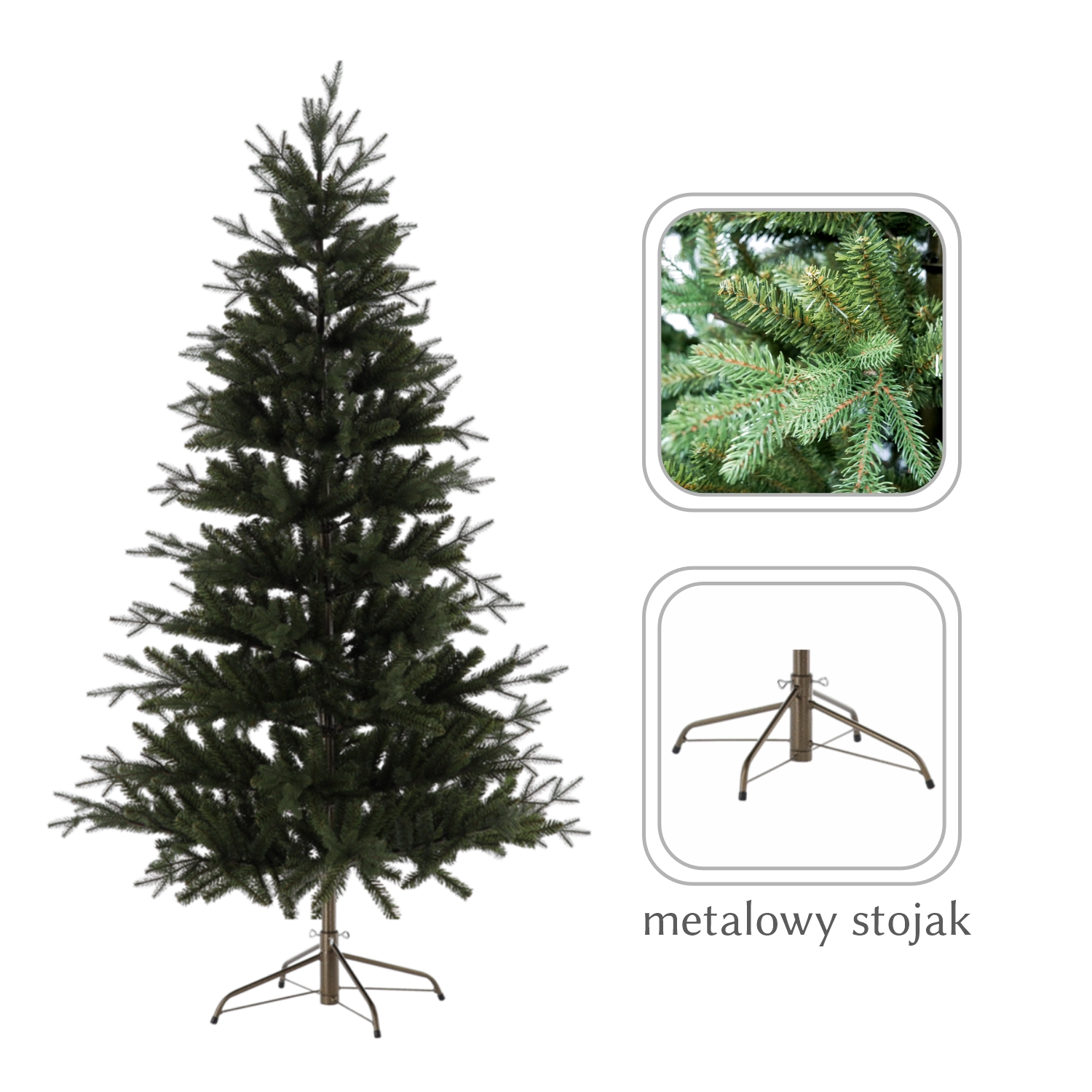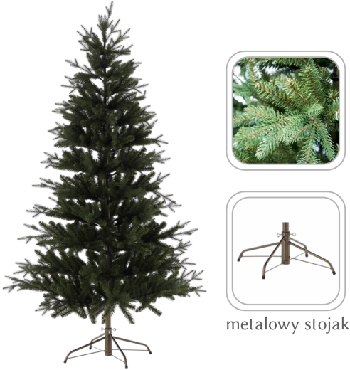 Dzięki wysokiej jakości materiałowi PVC gałęzie są podatne na formowanie, wytrzymałe i zachowują intensywnie zielony kolor przez wiele sezonów. Solidny metalowy stojak zapewnia stabilność nawet przy bogatym zdobieniu i ułatwia bezpieczne ustawienie choinki.