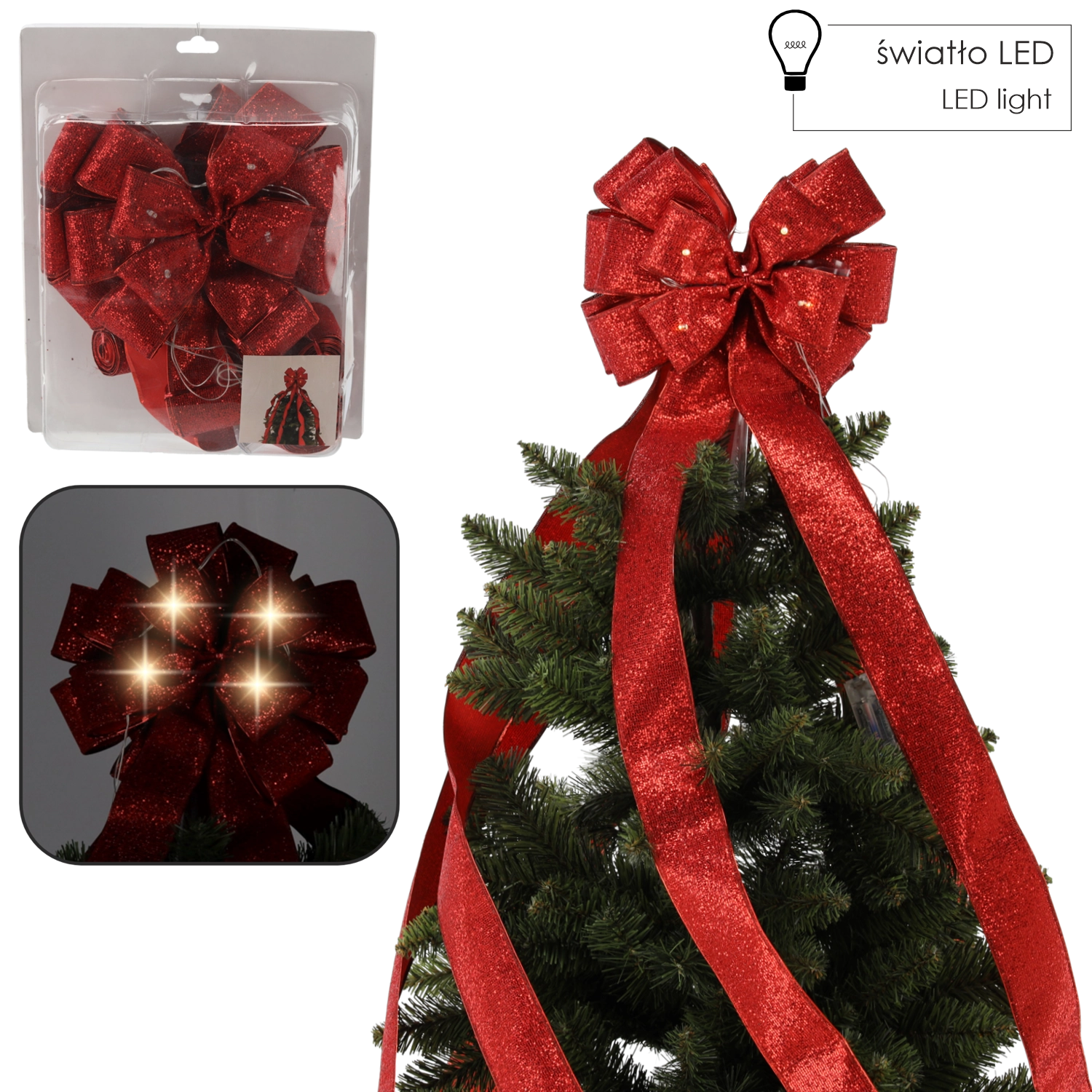 Ta stylowa czerwona kokarda została zaprojektowana na czubek choinki, gdzie natychmiast przyciąga wzrok i podkreśla jej kształt. Długie, 2,1‑metrowe wstążki elegancko spływają po gałązkach, tworząc harmonijny, reprezentacyjny wygląd. Zintegrowane diody LED emitują delikatne światło, które podkreśli świąteczną atmosferę Twojego domu.