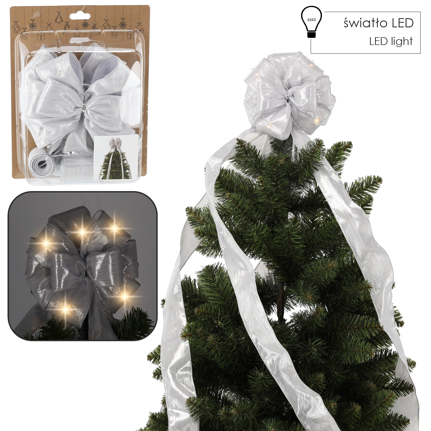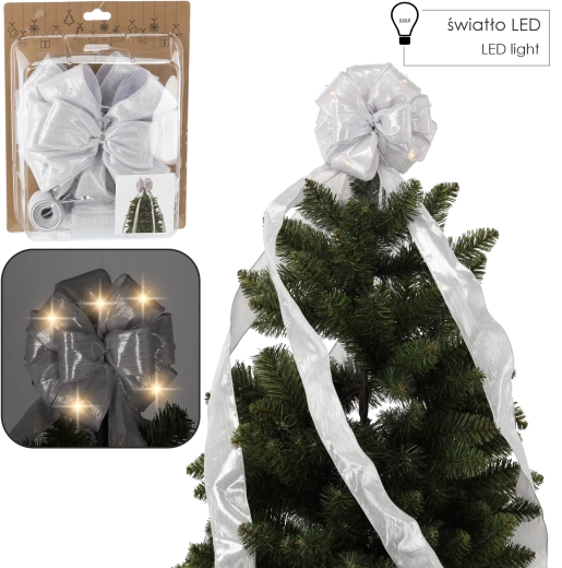 Elegancka srebrna kokarda z diody LED i długimi 1,8‑metrowymi wstążkami pięknie dopełni szczyt choinki. Lekka konstrukcja zapewnia łatwy montaż, bezpieczne działanie przy niskim napięciu oraz odpowiednio długi przewód zasilający 1,8 m, tworząc wygodne i efektowne rozwiązanie do nowoczesnych świątecznych dekoracji.