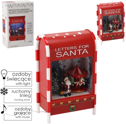 Ta dekoracyjna czerwona skrzynka to efektowny świąteczny dodatek z bogatymi efektami wizualnymi i dźwiękowymi. Zimne białe SMD LED podkreślają zimową atmosferę, a scena z Świętym Mikołajem, choinkami i karuzelą tworzy magiczny, ruchomy obraz. Funkcja efektu śnieżenia nadaje dekoracji autentyczny świąteczny nastrój.