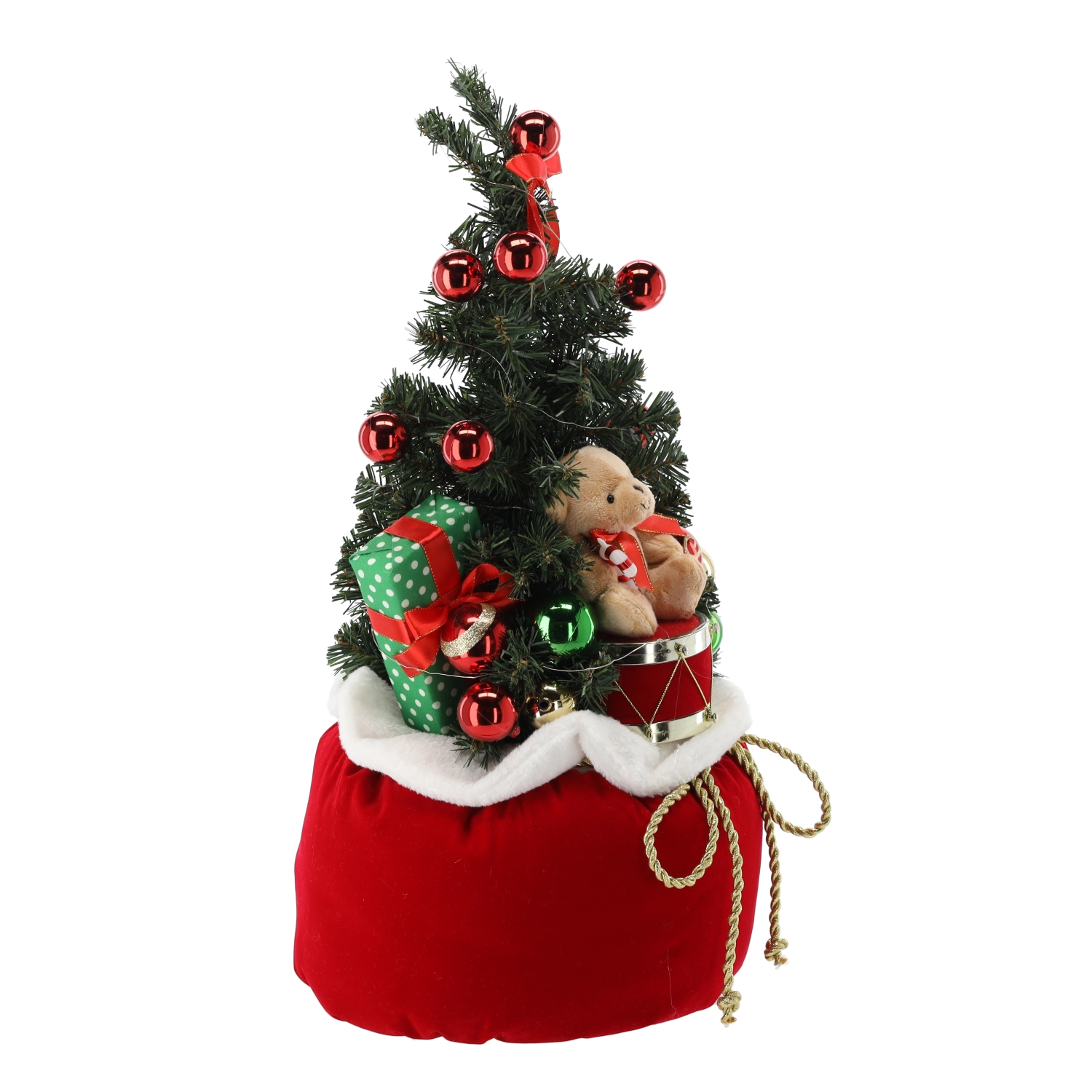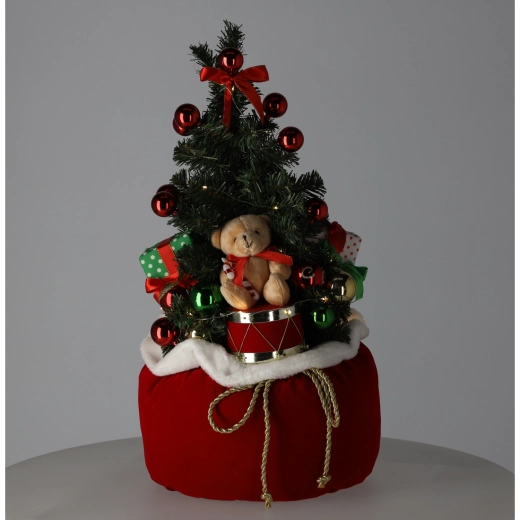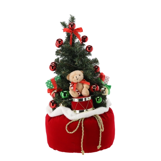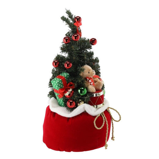 Miękki czerwony woreczek z białym brzegiem i złotym sznurkiem dodaje dekoracji uroku i stabilnie utrzymuje choinkę na miejscu.