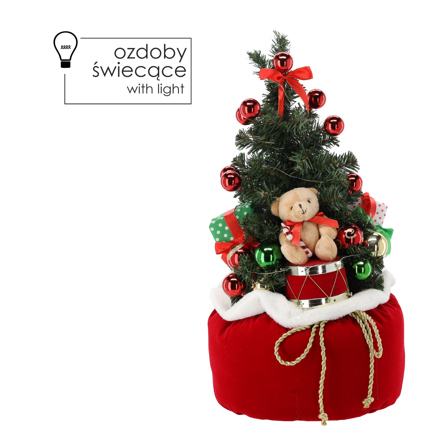 Choinka ozdobiona jest czerwonymi i zielonymi bombkami, kokardkami i uroczymi dekoracjami, więc wystarczy ją rozpakować i ustawić.